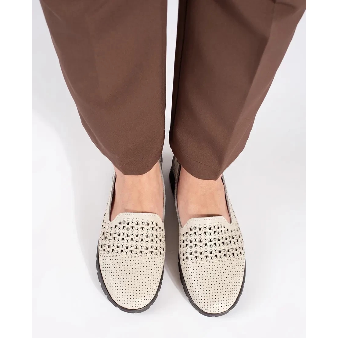 L'insert en cuir naturel s'occupe de la commodité et de la ventilation adéquate des pieds, ce qui augmente le confort de l'utilisation. La couleur beige universelle va parfaitement avec diverses stylisations, vous pouvez donc facilement les inclure dans votre garde-robe.