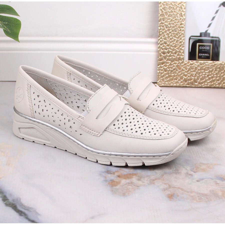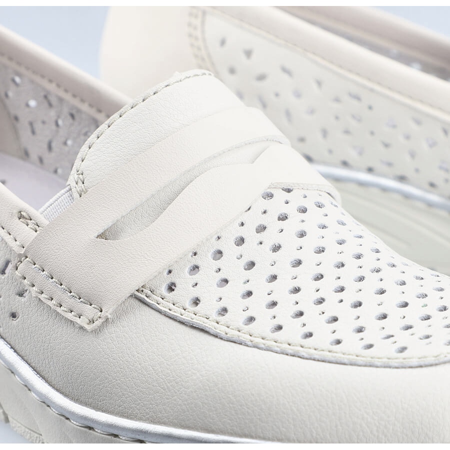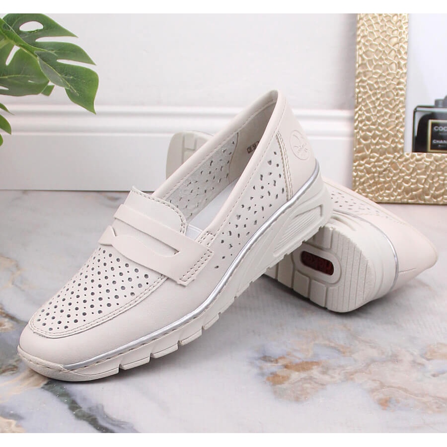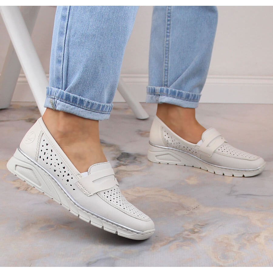 Détails: Chaussures compensées ajourées en cuir pour femmes Rieker N3356-80 blanche