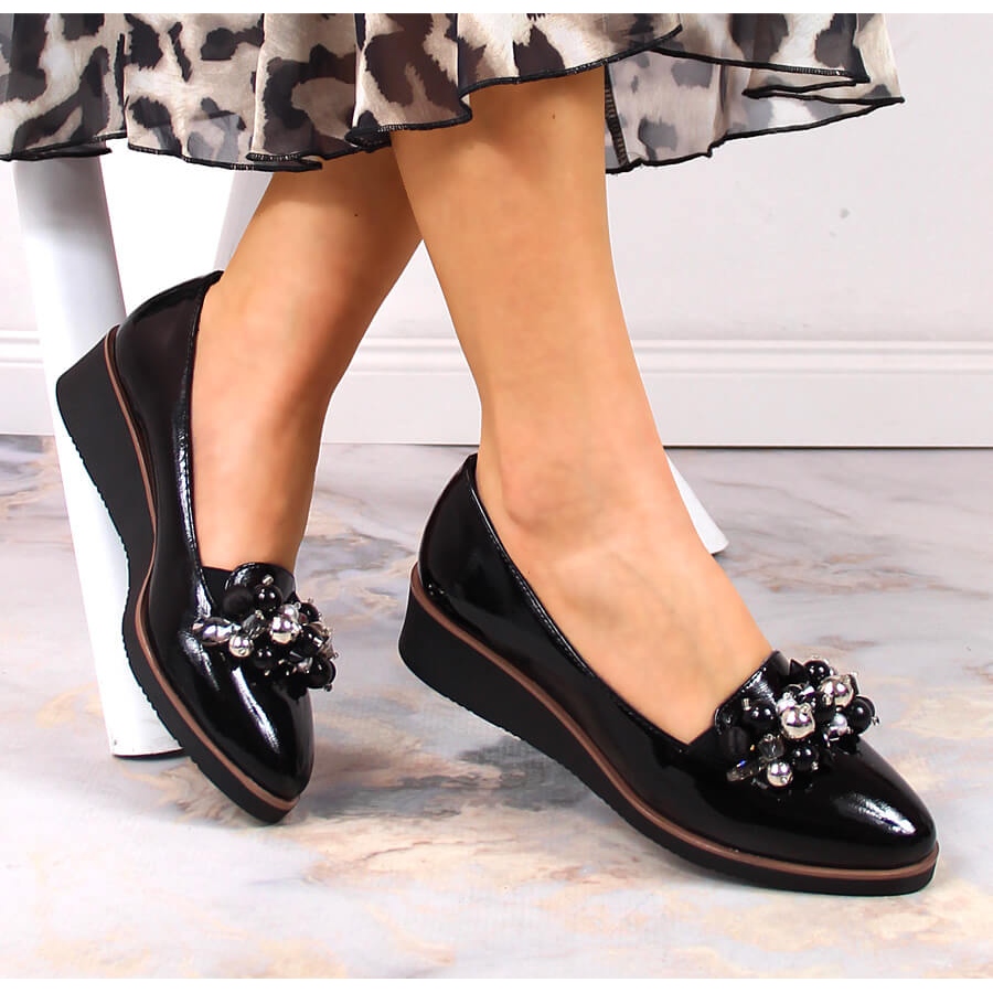 Ce modèle se caractérise par une finition attrayante - le vernis noir brillant attire l'attention et ajoute de l'élégance à n'importe quel style. Des perles décoratives sont subtilement appliquées sur les chaussures, leur conférant un caractère unique et sophistiqué.