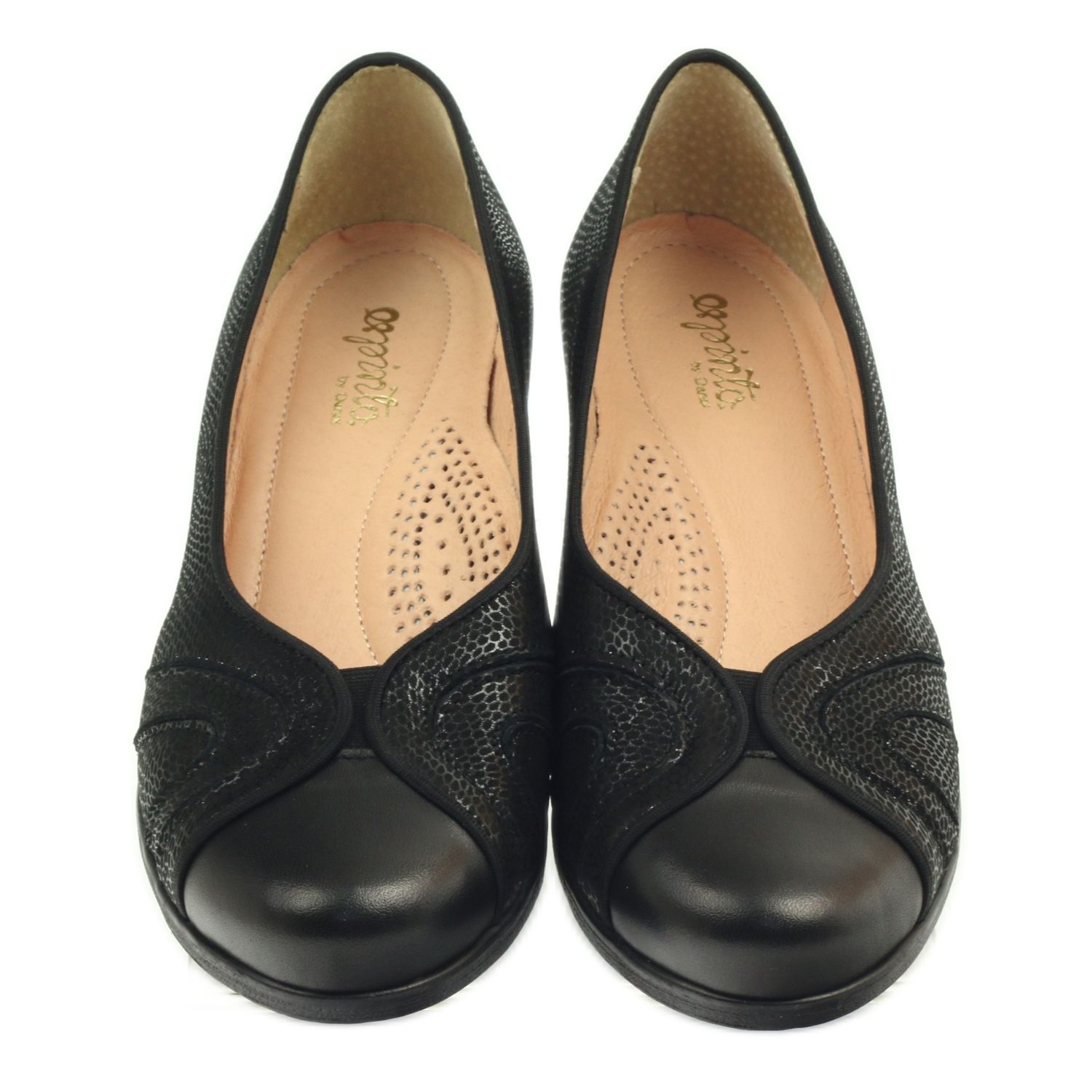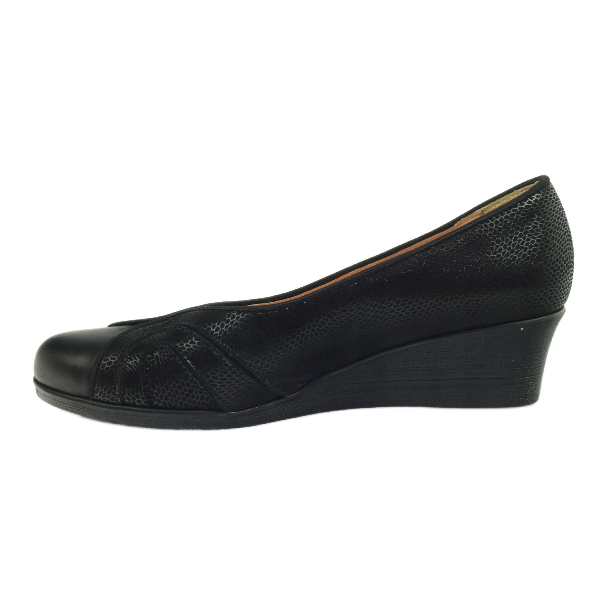 Les escarpins compensés noirs Espinto sont une combinaison parfaite d'élégance et de confort. Le modèle wz.232, dédié aux femmes qui apprécient à la fois le style et le confort, impressionne par sa forme classique et sa finition soignée en cuir naturel gaufré. Une cale de 4,5 cm de hauteur ajoute du piquant subtil tout en assurant stabilité et confort au quotidien.