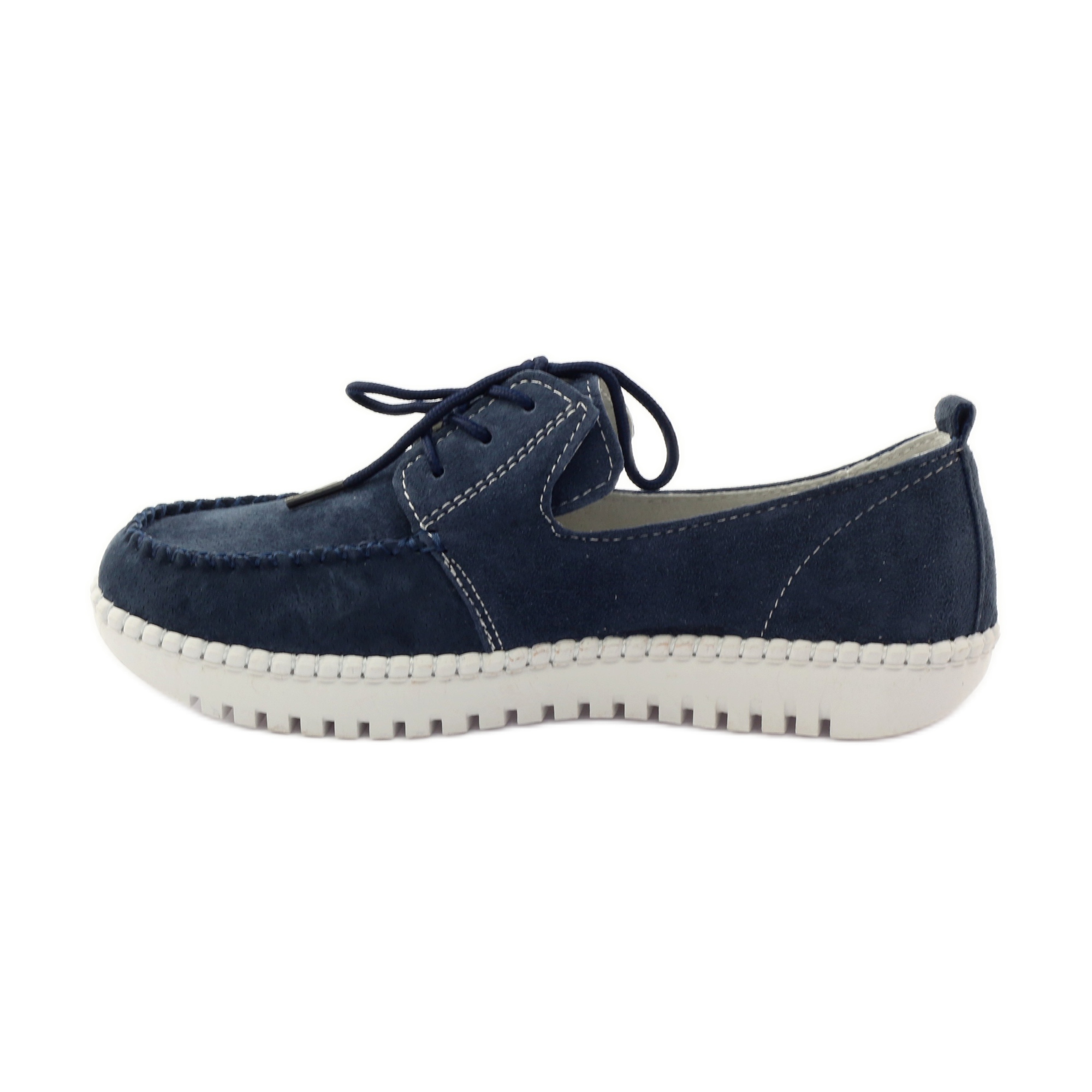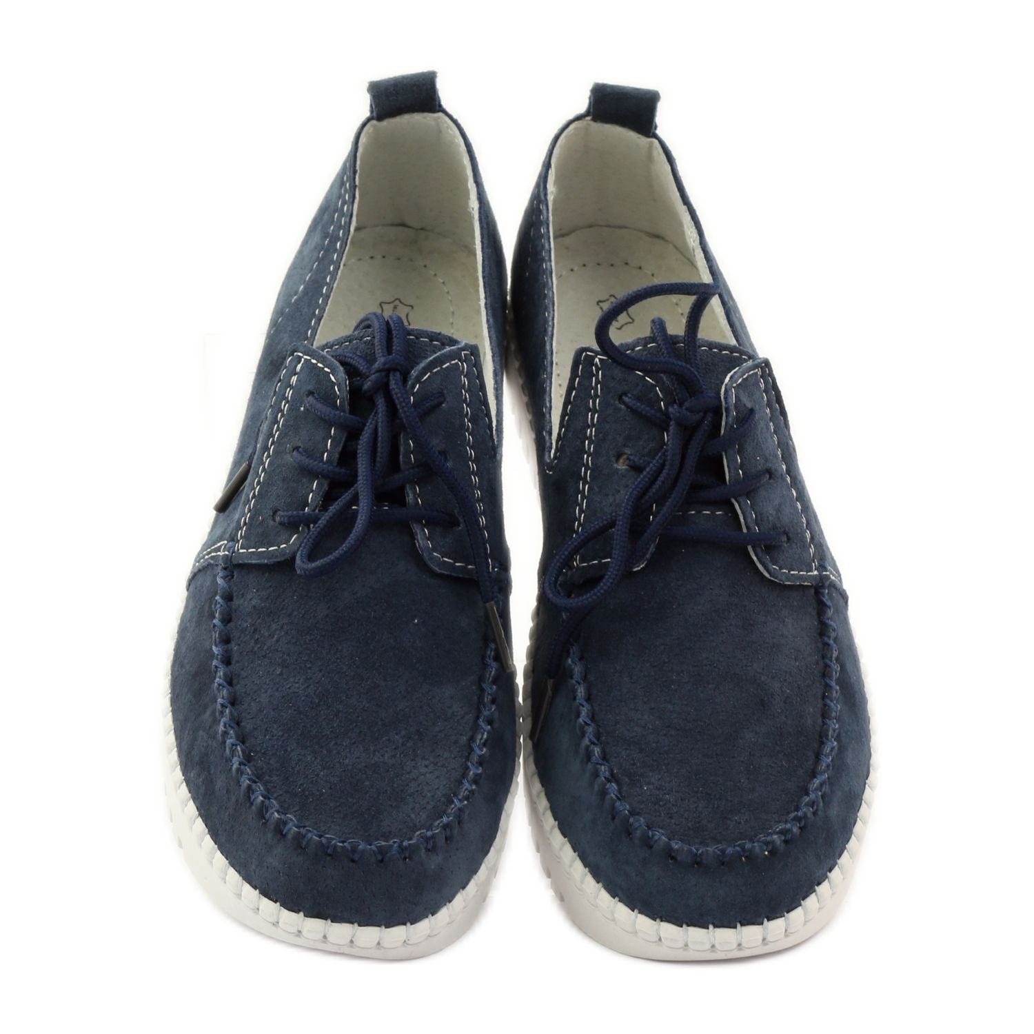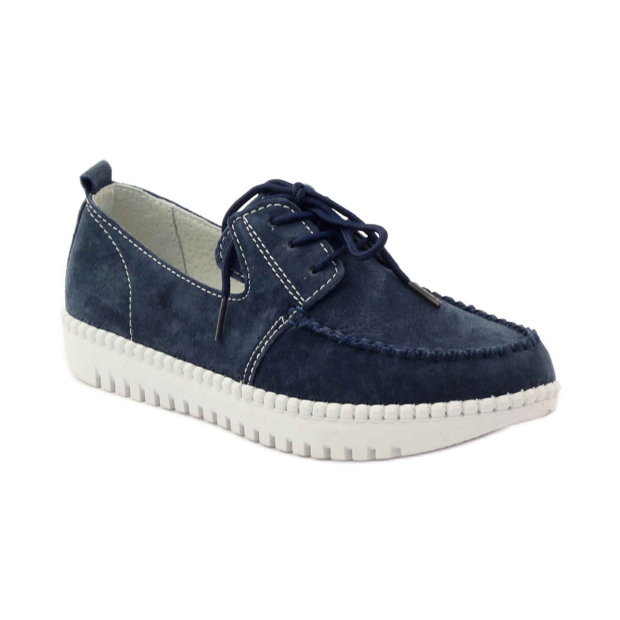 La tige et l'intérieur de ces chaussures sont en cuir naturel, ce qui garantit non seulement la durabilité, mais également une excellente ventilation, ce qui est particulièrement important lors des journées les plus chaudes. La couleur bleu marine des chaussures, complétée par des surpiqûres blanches, leur confère un look moderne et stylé.