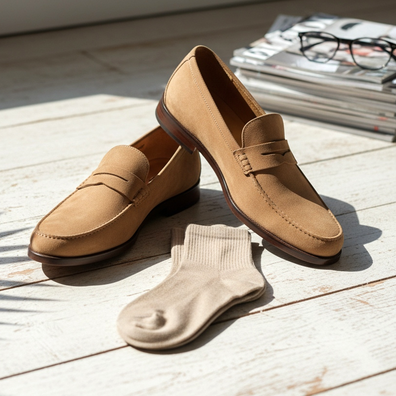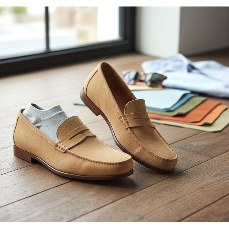 Le meilleur choix pour l’été sont les mocassins. Ils sont élégants mais moins formels que les richelieus. Vous pouvez choisir des mocassins classiques ou des mocassins à pampilles. Si le code vestimentaire le permet, portez-les sans chaussettes visibles (en utilisant des chaussettes basses, dites invisibles). La cheville exposée ajoute de la légèreté et de la fraîcheur au style.
