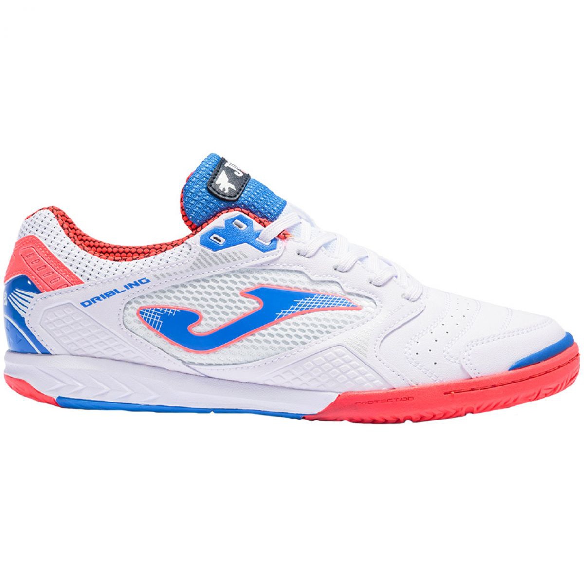 Les chaussures de football Joma Dribling M 2102 In Sala sont un excellent choix pour tous les fans de football qui recherchent confort et performance sur le terrain. Ces baskets basses, disponibles dans une élégante combinaison de couleurs bleu, blanc et orange, allient design moderne et fonctionnalité.
