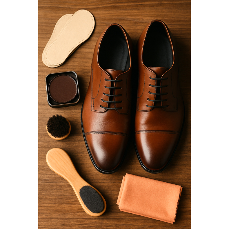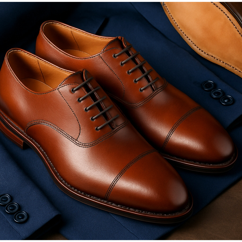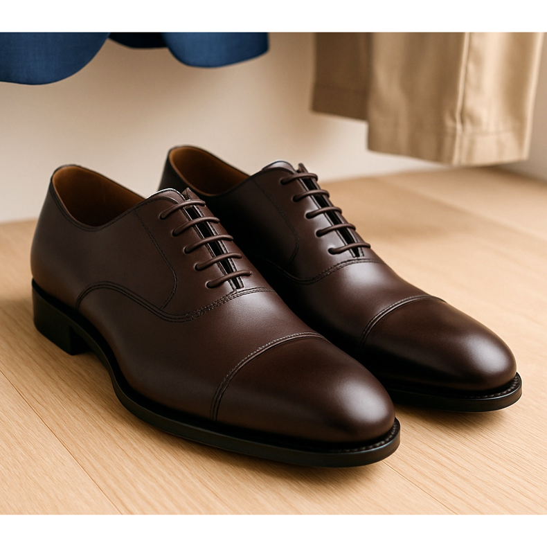Pour un mariage, choisissez des chaussures en cuir de la plus haute qualité – pleine fleur ou première fleur. Le cuir doit être lisse, sans défauts visibles, et bien habillé. Évitez le cuir gaufré imitant la texture et le cuir écologique - ils ont l'air bon marché. La semelle doit être en cuir ou en caoutchouc de haute qualité (légèrement plus confortable). Vérifiez la finition : coutures régulières, semelle bien collée selon la méthode Goodyear welted ou Blake. L'intérieur de la chaussure doit être en cuir - il offre une meilleure ventilation lors d'une longue cérémonie.