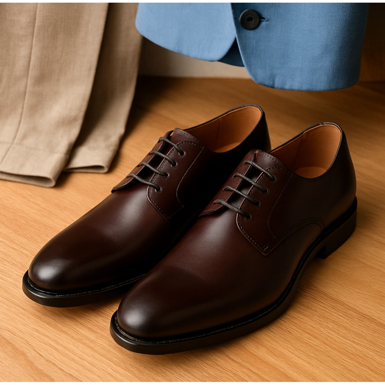 Les chaussures derby sont des chaussures ouvertes à lacets, légèrement moins formelles que les richelieus, mais tout à fait appropriées pour un mariage. Ils conviennent particulièrement aux mariages rustiques, aux garden-parties ou aux célébrations estivales. Un derby lisse en marron foncé ou bordeaux est un excellent choix pour les costumes beiges, olive ou bleus. Le derby uni (sans brocart) est plus formel que les modèles avec décoration. C'est une excellente option pour les clients qui apprécient le confort : les chaussures derby sont généralement plus confortables lorsqu'elles sont portées pendant de longues périodes.