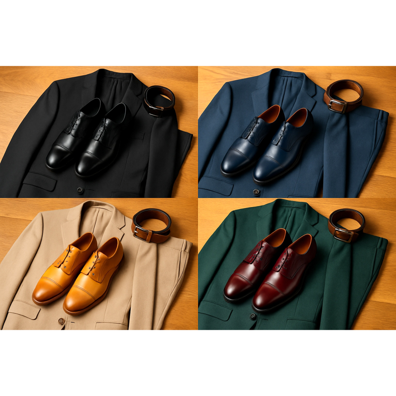 Règle de base : les chaussures noires s'accordent avec les costumes noirs, bleu marine, anthracite et gris foncé. Les chaussures marron (du bronzage clair au cognac en passant par le marron foncé) se marient bien avec les costumes beiges, gris clair, bleus et verts. Ne combinez jamais des chaussures noires avec une ceinture marron ou des chaussures marron avec une ceinture noire - la ceinture et les chaussures doivent être de la même couleur. Les chaussures bordeaux (oxblood, bordeaux) sont une alternative universelle : elles s'agencent aussi bien aux costumes foncés qu'aux costumes clairs. Évitez les chaussures marron clair pour les mariages très formels.