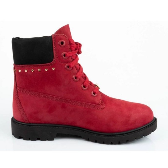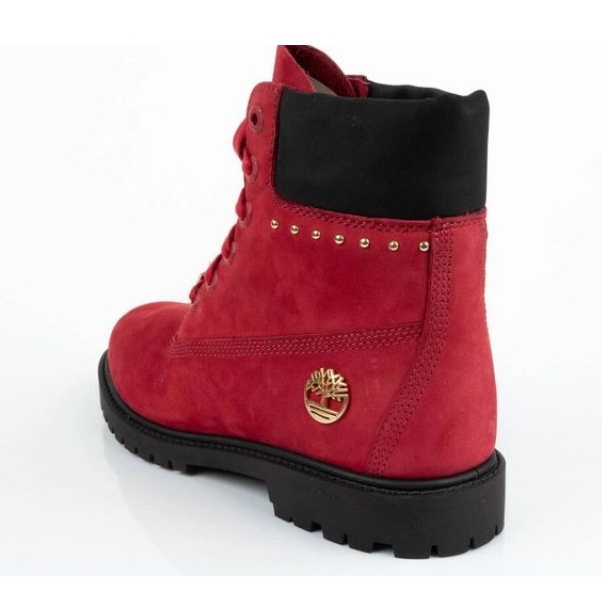 Élégants, fonctionnels et respectueux de l'environnement - Chaussures de trekking pour femmes Heritage Timberland 6 dans une botte étanche dans une couleur rouge intense avec des accessoires dorés. La combinaison d'un look classique avec les technologies modernes en fait une proposition idéale pour les stylisations urbaines lorsque vous avez besoin de confort, de chaleur et de résistance à l'humidité.