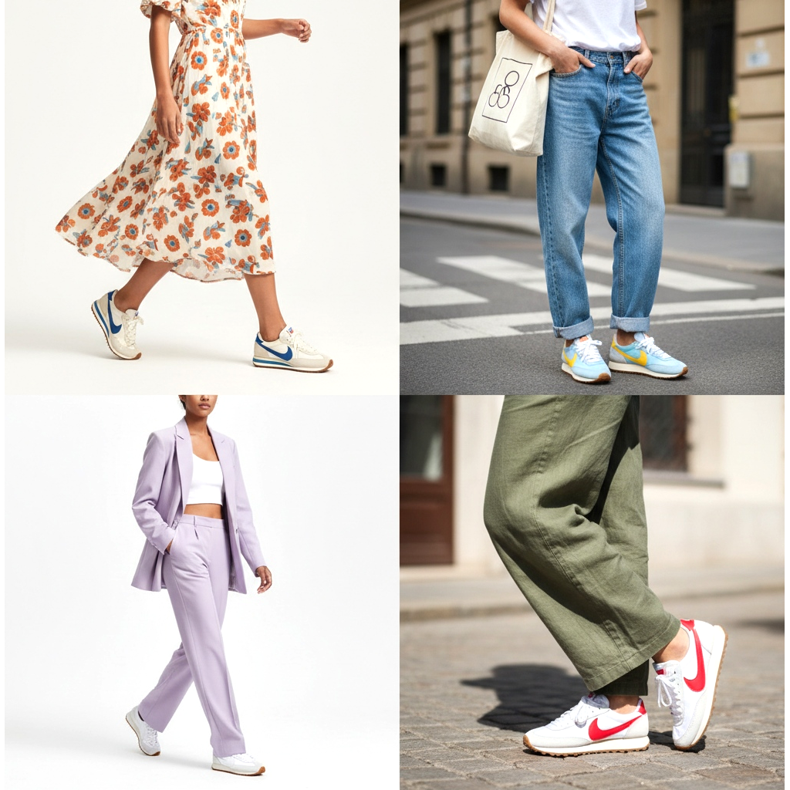 Pour une robe midi : Une robe midi légère en tissu avec des fleurs ou des motifs géométriques associée à des chaussures de course rétro crème est l'un des looks les plus populaires de la saison. Ce contraste entre la féminité de la robe et le caractère sportif de la chaussure crée un style exceptionnellement dynamique et frais.