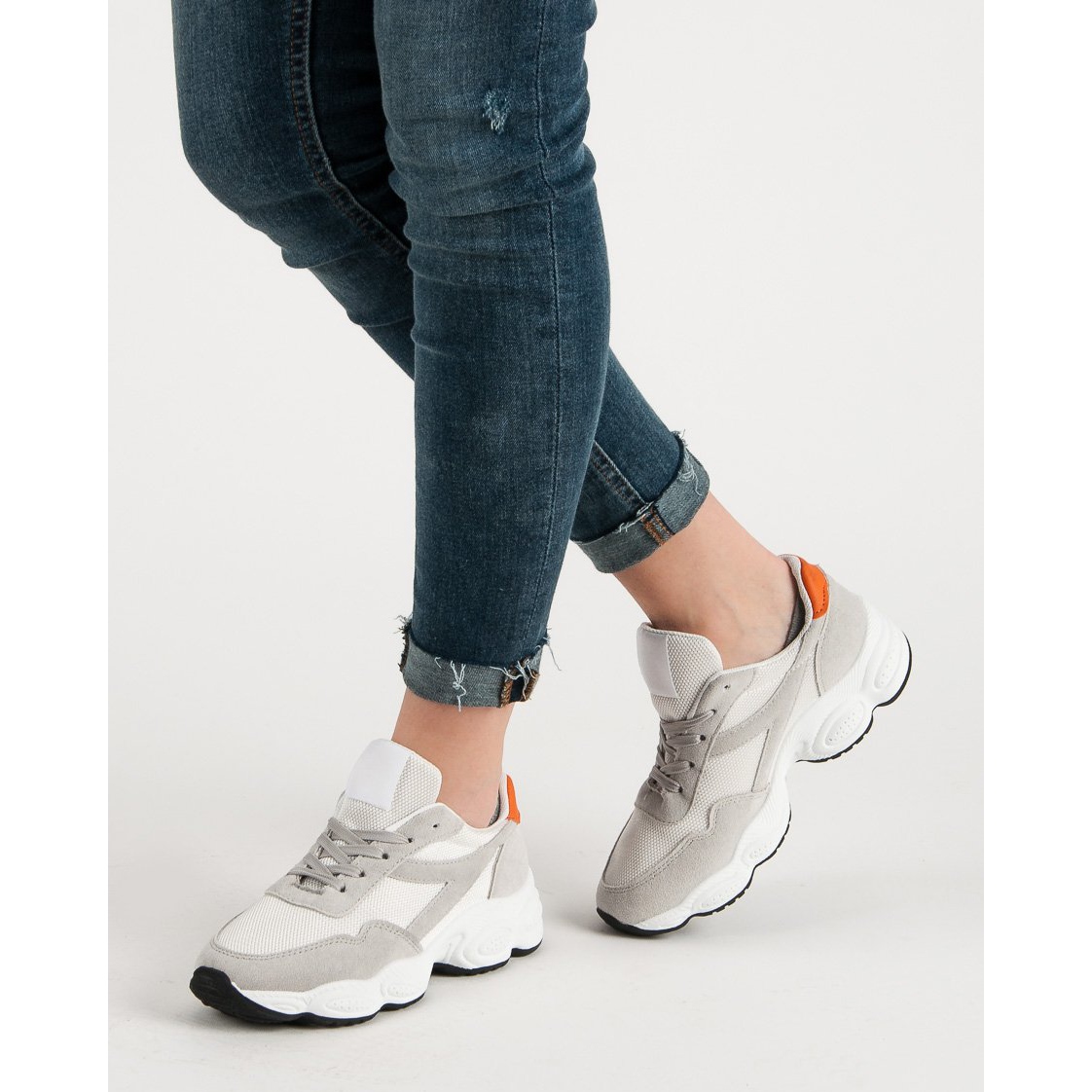 Soyez à la mode et active avec nos chaussures de sport à lacets en blanc et gris ! Parfait pour les femmes qui aiment combiner style avec une approche fonctionnelle de la mode au quotidien. Investissez dans la commodité et le confort dès aujourd’hui !