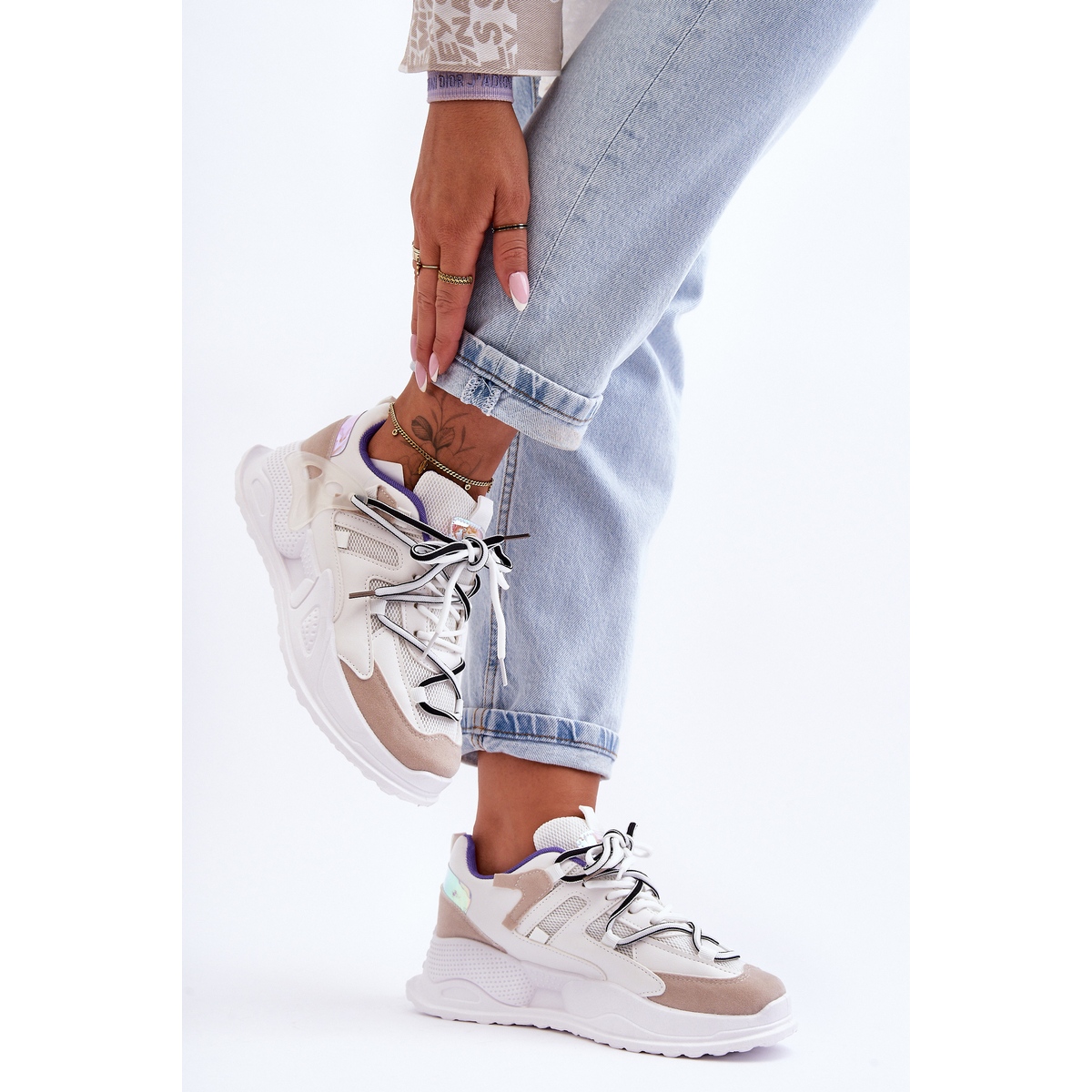 Le modèle se distingue par un double laçage et une plateforme massive qui ajoute de la légèreté à chaque marche. La semelle intérieure en tissu doux assure le confort du pied, même pendant de longues heures d'utilisation. Une tige haute atteignant 6 cm et un talon de 4 cm garantissent la stabilité et en même temps un look attrayant.