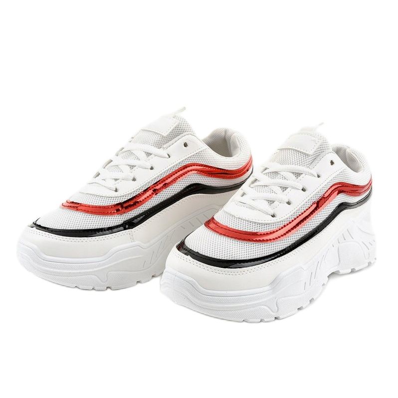 Le design des chaussures se distingue par un blanc élégant, mis en valeur par des inserts rouges et noirs accrocheurs, qui leur confèrent un caractère moderne. Le bout rond et la fermeture à lacets assurent non seulement un confort, mais également un ajustement parfait au pied. La hauteur de la chaussure de 10 cm et la plateforme de 4 cm de hauteur offrent un confort supplémentaire lors du port.