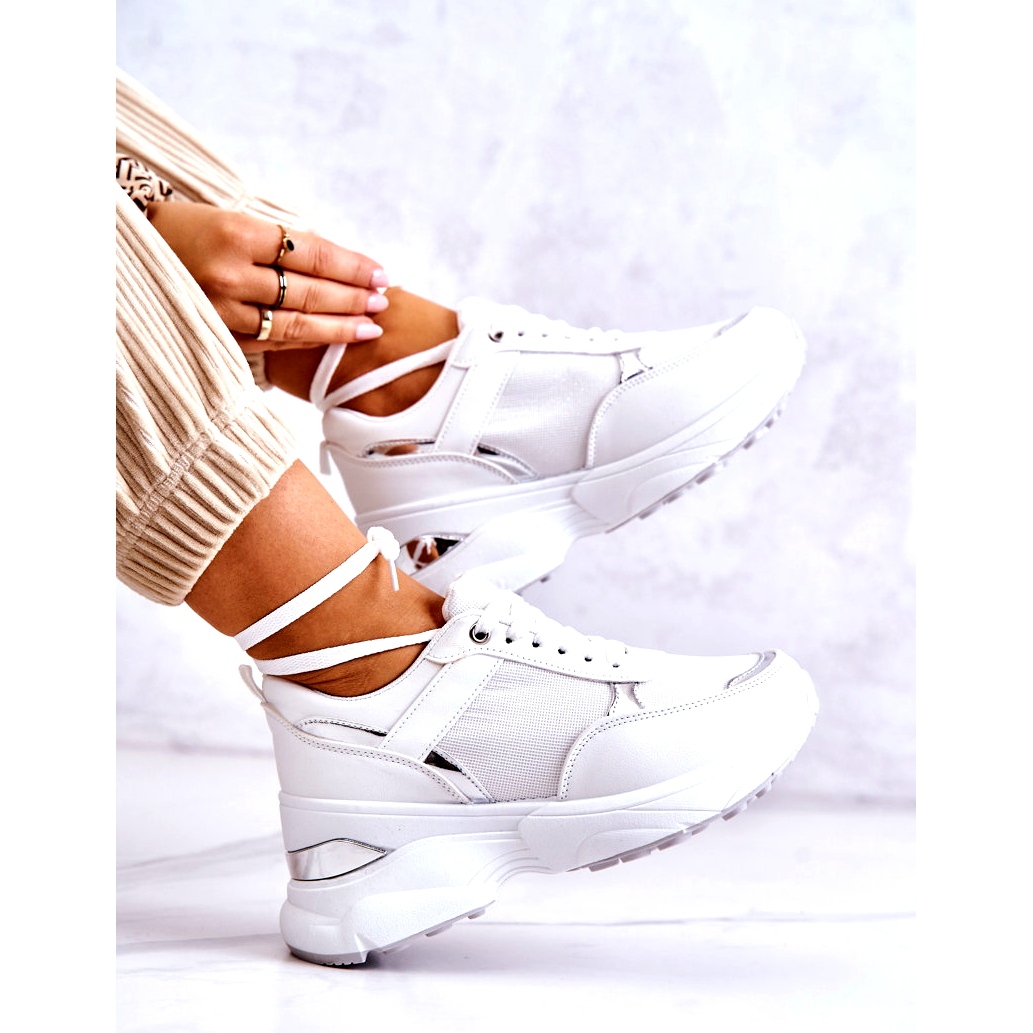 Les chaussures de sport compensées blanches brillantes pour femmes de PG1 sont un choix idéal pour les femmes qui souhaitent allier confort et look à la mode. Fabriqués en tissu aéré et en cuir écologique, ils allient esthétique et fonctionnalité. Elles attirent l'attention grâce à la finition pailletée sur le tissu en maille et à l'élément miroir dans le talon, qui leur donne un éclat unique.