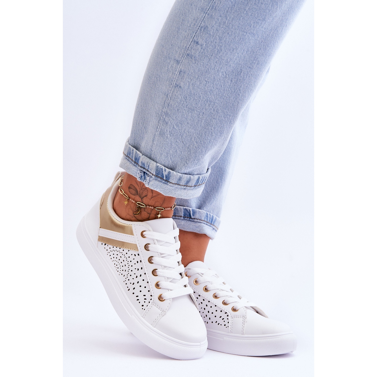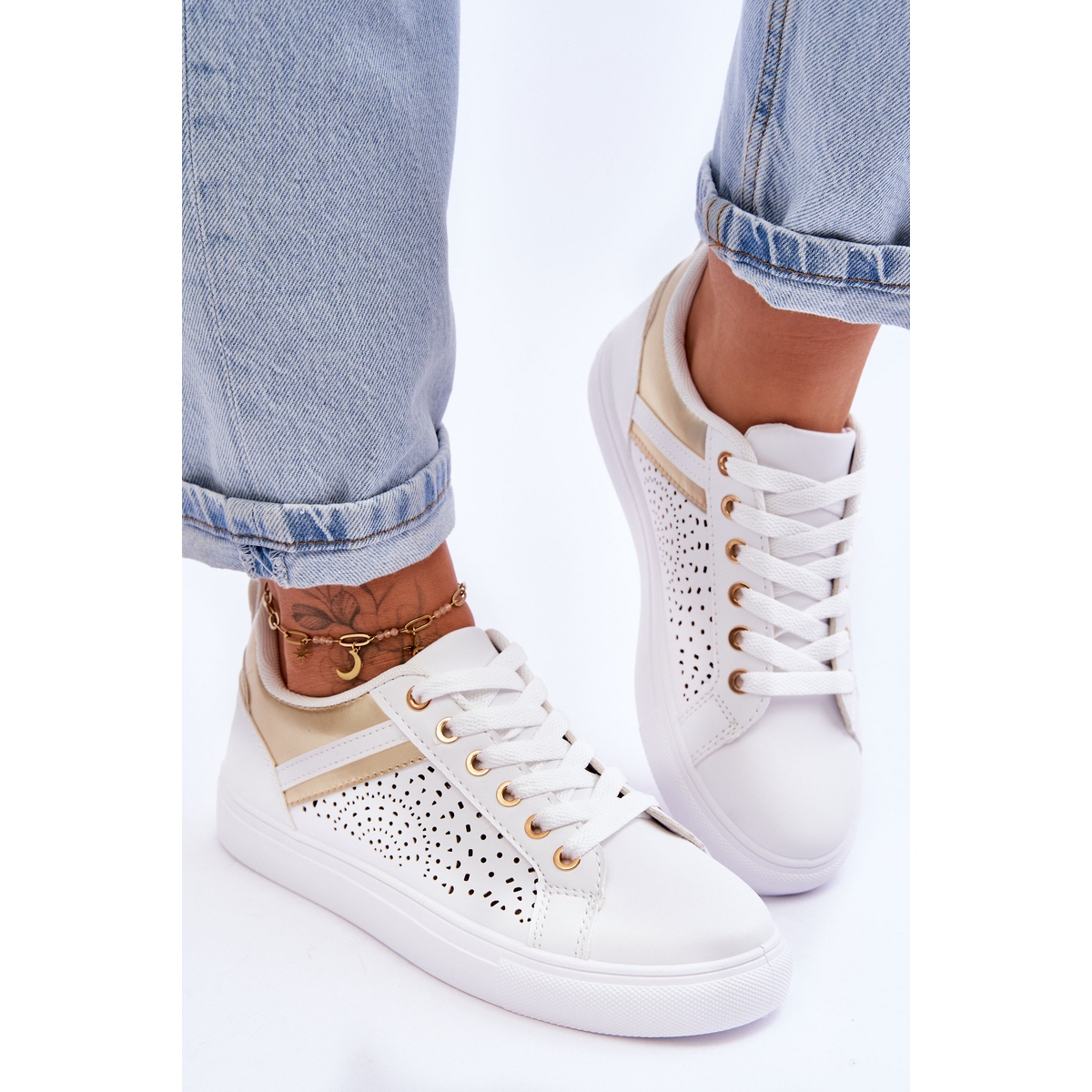 **Chaussures de sport classiques à motif ajouré, blanches et dorées plus heureuses**