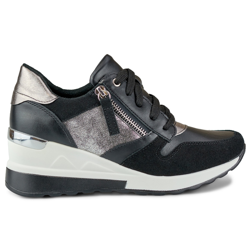 Moderne, féminine et confortable - Des chaussures de sport noires en flèche de la collection Keeshoes combinent un personnage sportif avec une augmentation subtile. Parfait pour les stylisations urbaines, tous les jours et les sorties, lorsque vous souhaitez ajouter quelques centimètres sans renforcer le confort.