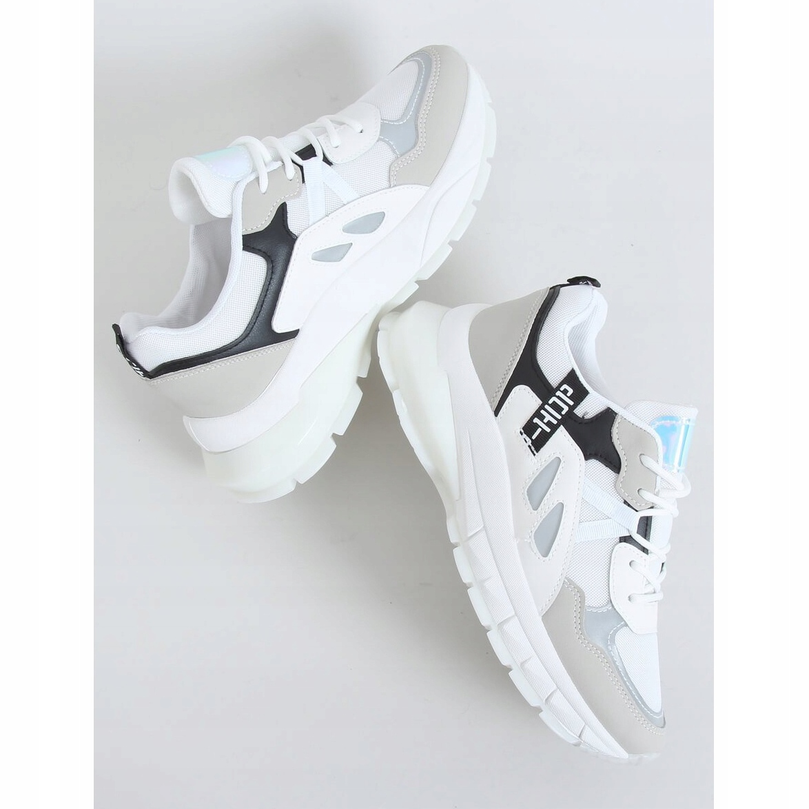 La caractéristique clé des chaussures B0-553 WHITE/BLACK est leur semelle massive mais légère en matière synthétique, qui offre un excellent amorti et une excellente stabilité à chaque pas. Le design ajouré élégant et la combinaison de la couleur blanche des chaussures avec des éléments multicolores et holographiques en font un choix attrayant pour les femmes qui apprécient un look tendance et dynamique.