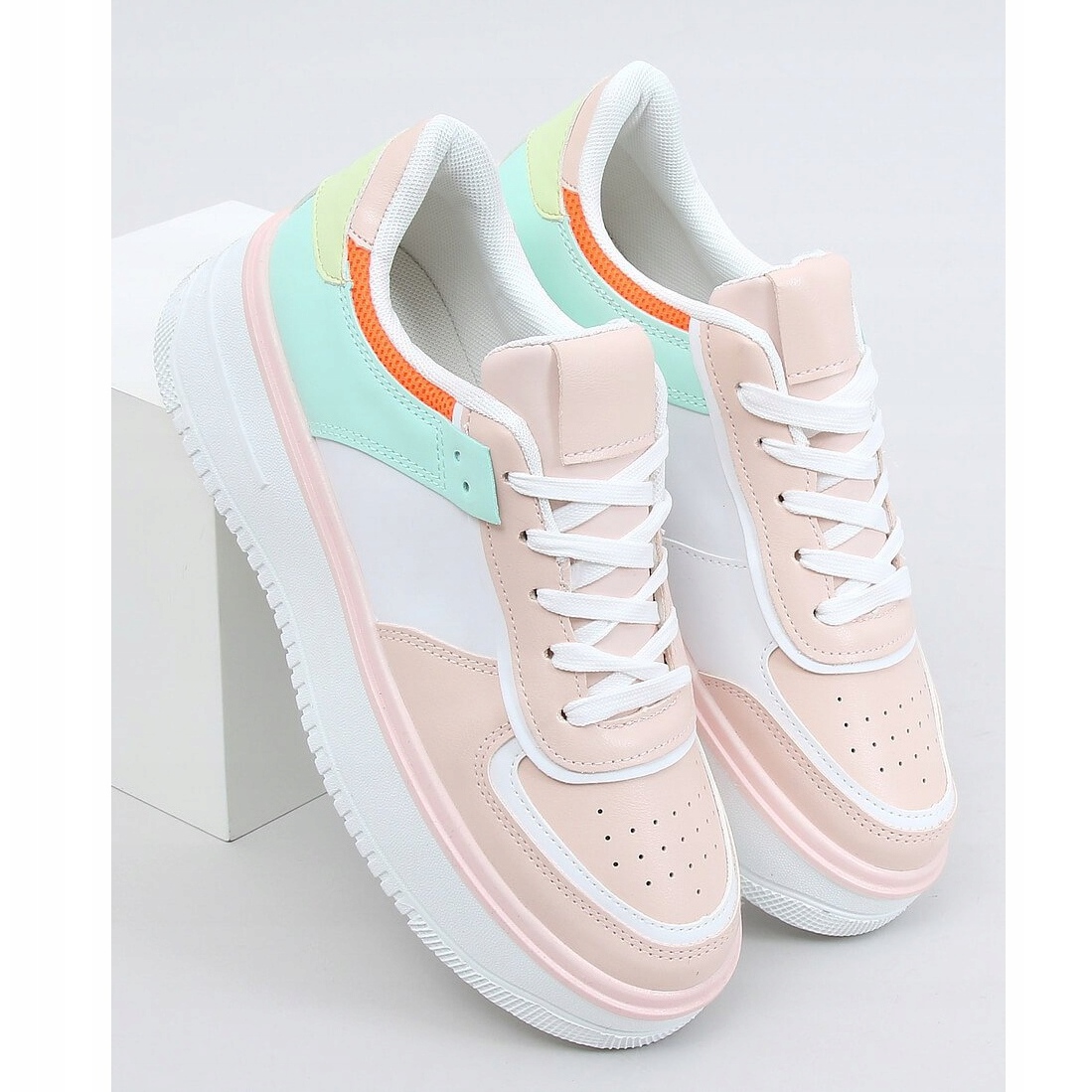 Les chaussures de sport se distinguent par des couleurs pastel et une semelle haute la plus tendance d'une hauteur de 4 cm, ce qui les rend non seulement confortables, mais aussi à la mode. Le nez rond et l'absence de motifs soulignent leur universalité, les rendant faciles à assortir à différents styles.