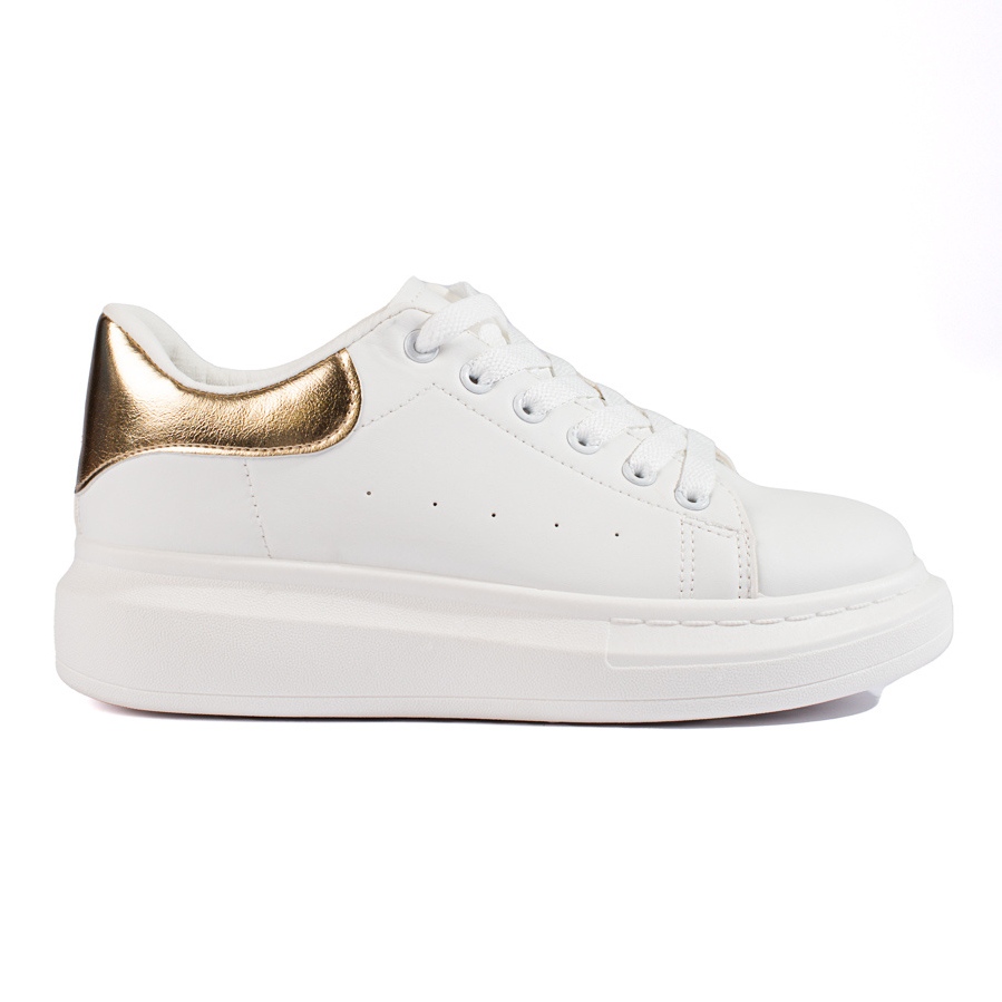 Les chaussures de sport blanches pour femmes Shelovet n'ont pas de talon et se caractérisent par un talon bâti et souple qui ajoute de la stabilité pendant la marche. La semelle en caoutchouc a des propriétés antidérapantes et résiste à l'abrasion. La plate-forme de 5 cm de hauteur assure un pas sûr et soulève en même temps la silhouette en douceur.