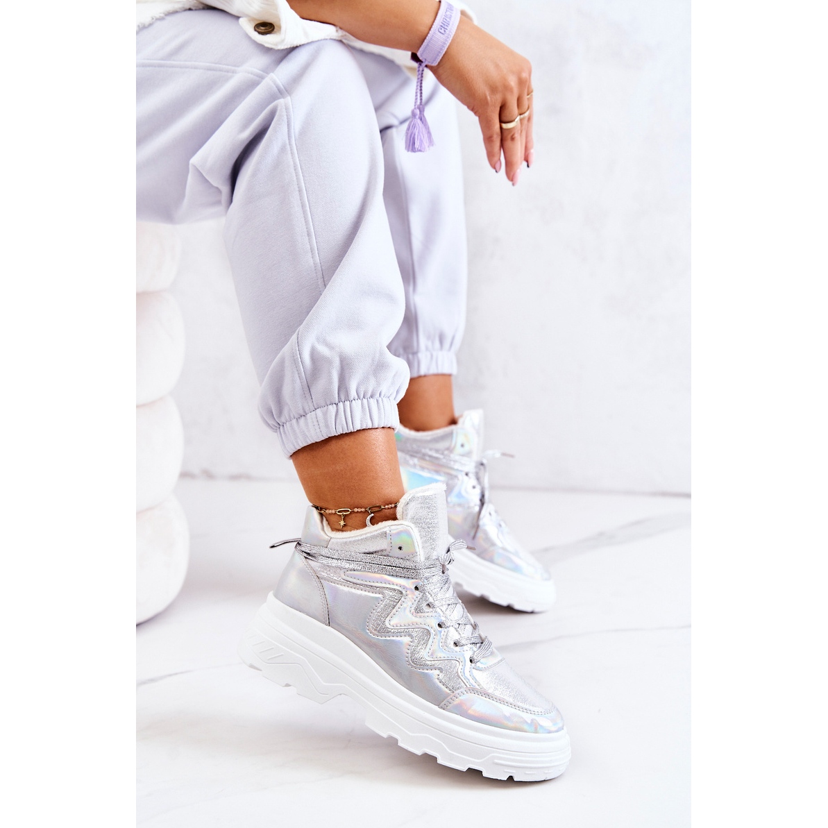 Chaussures de sport modernes et hautes Joenne combinez un brillant à la mode et métallique avec des propriétés d'isolation pratiques. Une semelle épaisse et massive et une fourrure douce à l'intérieur offrent de la chaleur et du confort pendant les jours plus frais, et la couleur argentée universelle ajoutera du caractère à de nombreuses stylisations.