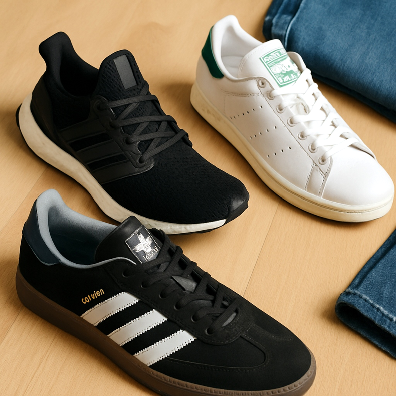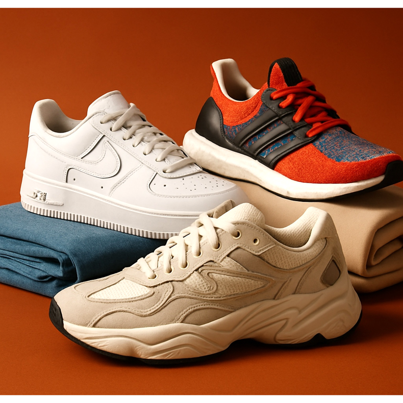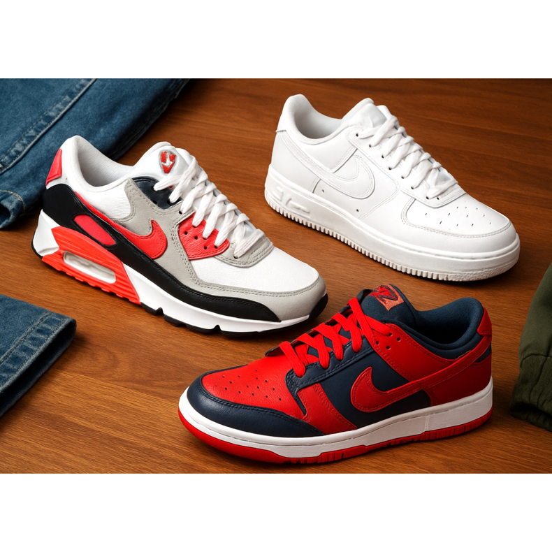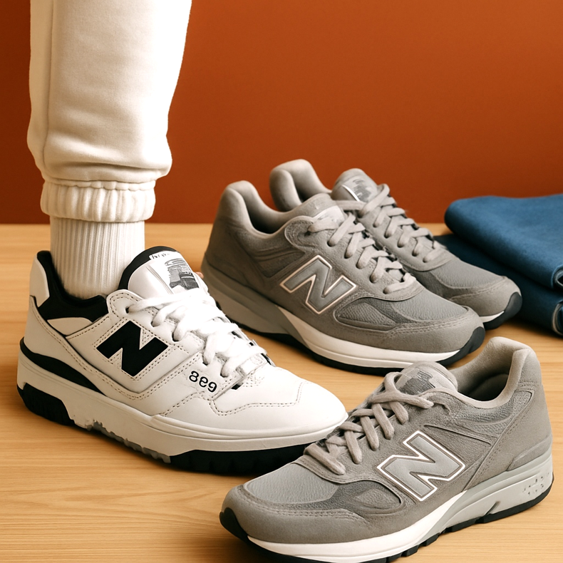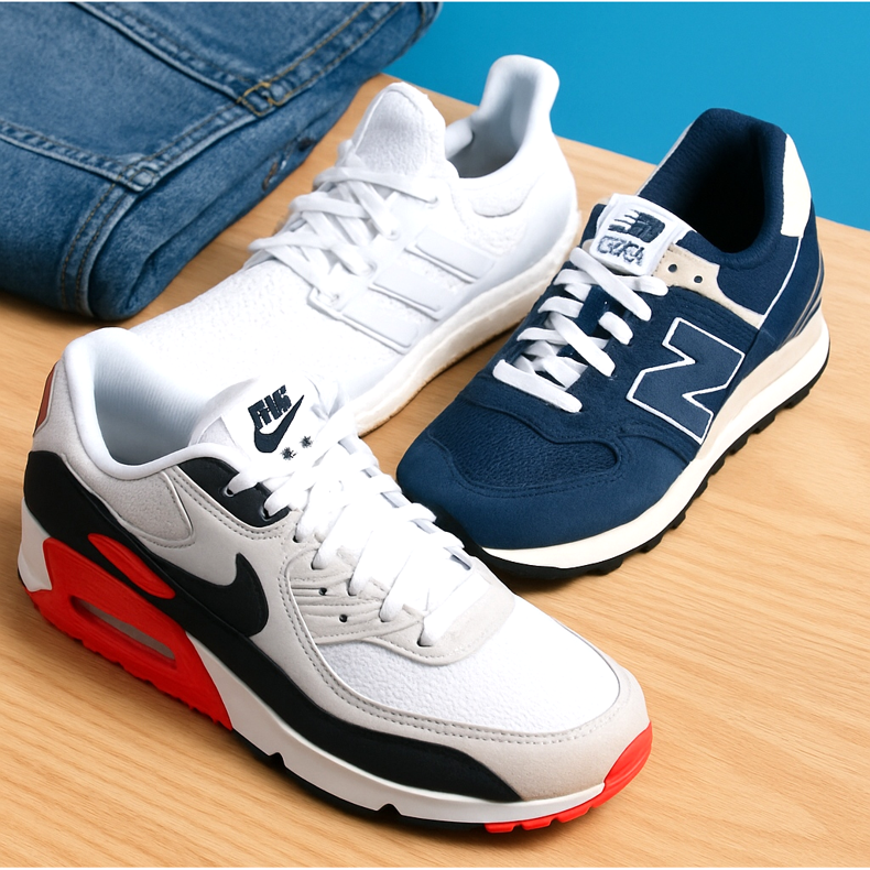 Air Max 90 (gris/blanc), New Balance 550 (blanc/gris), Ultraboost (noir/gris). Décontracté, confortable, universel.