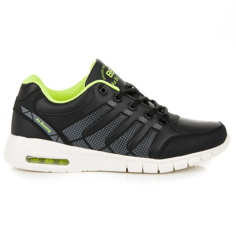 Axe Boxing - des chaussures de sport noires pour les hommes qui apprécient le confort et un look moderne. Le modèle combine une tige noire intemporelle avec une semelle blanche contrastée et un intérieur vert fluo énergique - un accent subtil qui les distingue des autres.