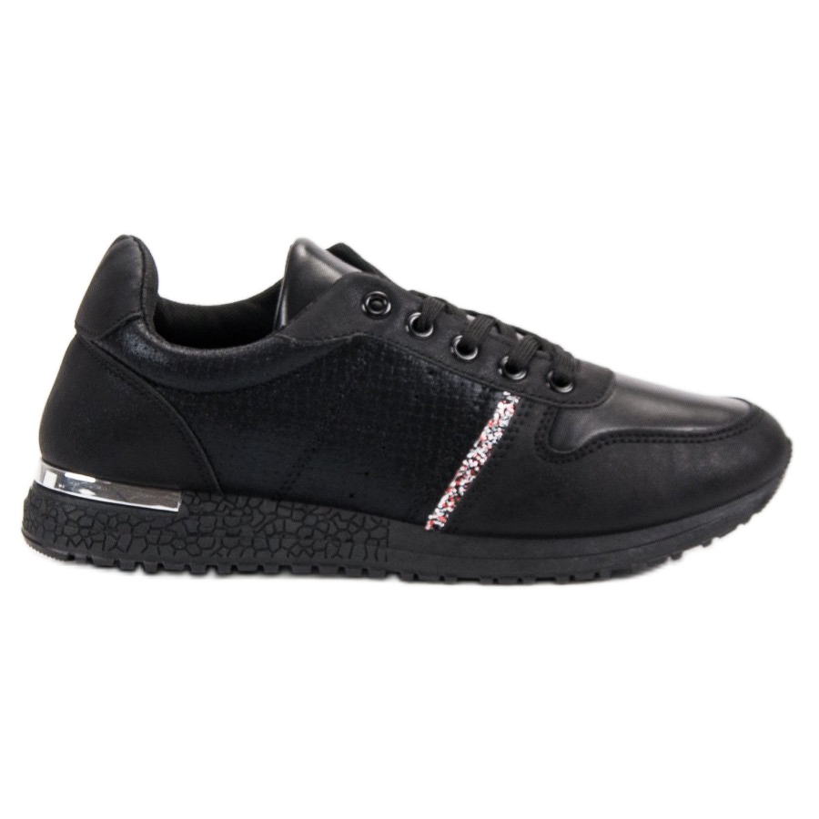 Les chaussures de sport Jumex noires avec talon souple intégré et fermeture à lacets s'adaptent à la forme du pied, assurant stabilité et confort d'utilisation. La hauteur de la plateforme est de 3 cm, ce qui augmente encore le confort de port, et le matériau de la semelle est en plastique avec une bande de roulement assurant une bonne adhérence sur diverses surfaces.