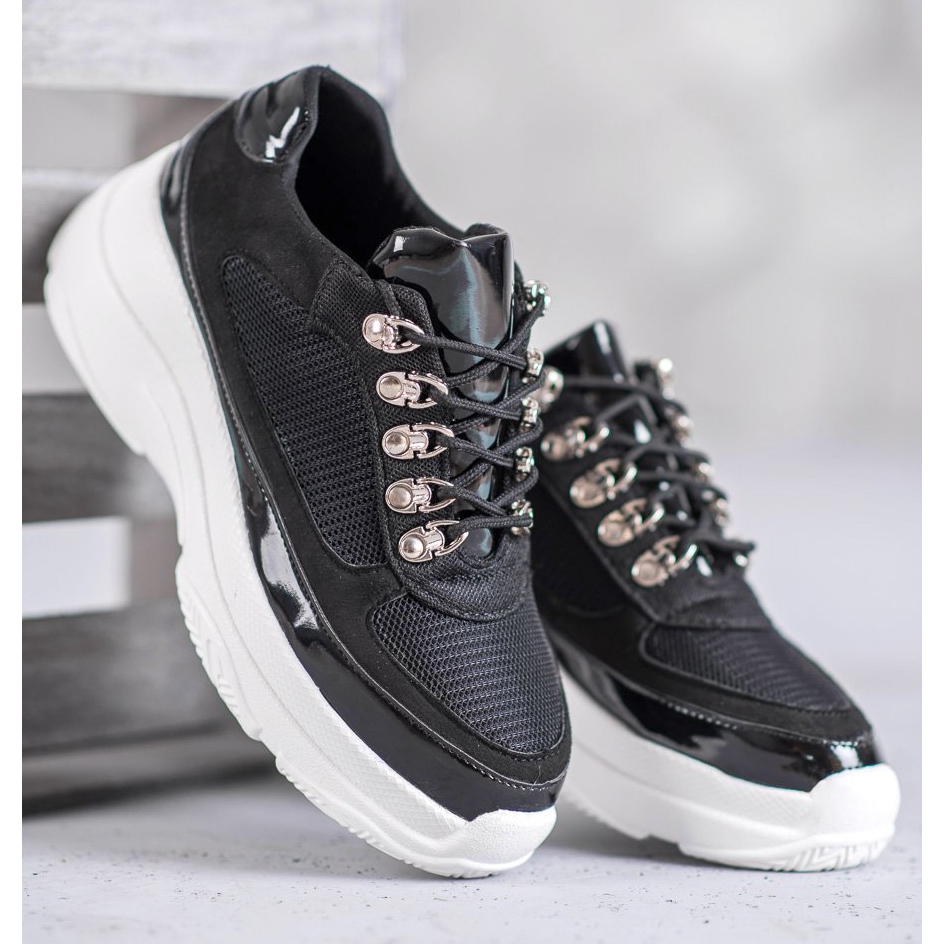 La tige noire des chaussures est décorée d'inserts en mesh, qui assurent une ventilation et un confort optimaux au porté, même par temps chaud. Les plateformes d'une hauteur de 5,5 cm ajoutent non seulement de la légèreté à la silhouette, mais vous isolent également du sol, ce qui affecte le confort d'utilisation. La languette vernie, le contrefort du talon et les détails élégants le long de la tige sont des éléments qui donnent du caractère et un look tendance aux chaussures.