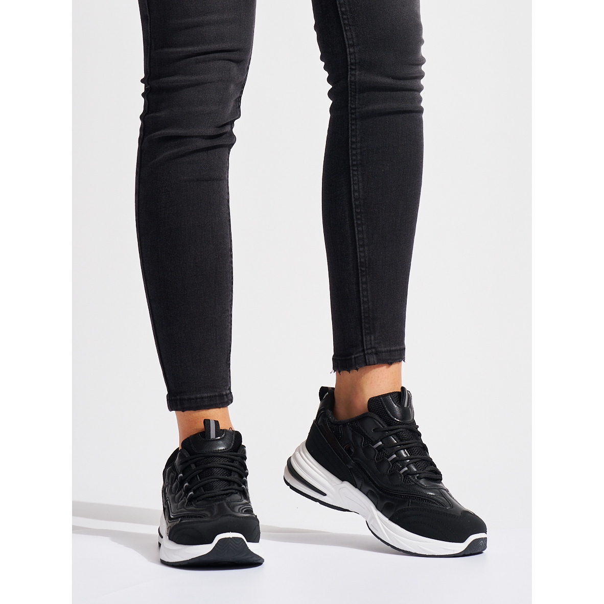 Nous présentons des chaussures de sport pour femmes noires sur une semelle épaisse d'une marque réputée, qui combine parfaitement le confort avec le design à la mode. Ces chaussures élégantes sont un excellent choix chaque jour, combinant le style sportif avec les tendances de la mode actuelles.