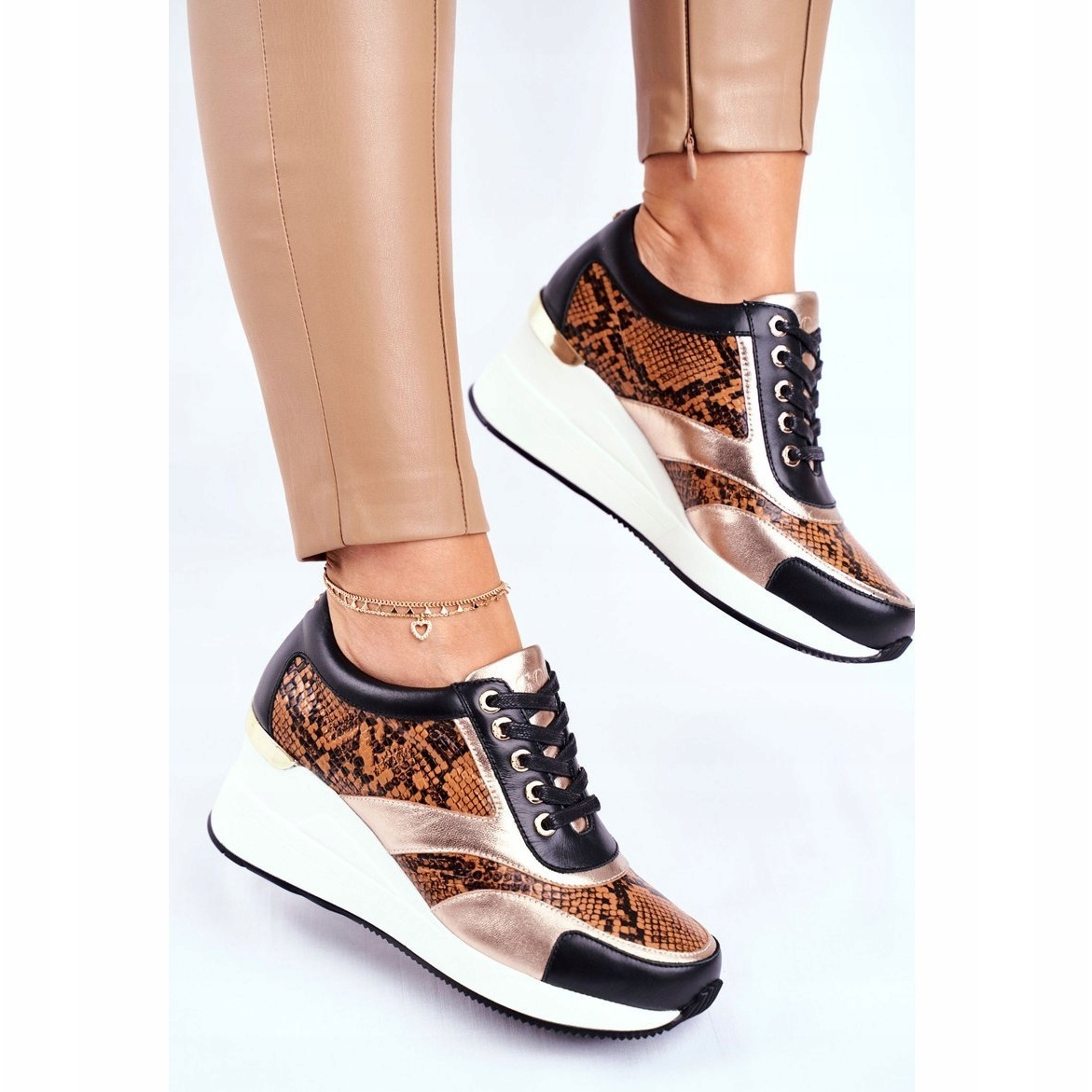 Des baskets élégantes et confortables de Goe, en cuir naturel, qui combinent un personnage sportif avec une note de style féminine. Le modèle est distingué par un motif animal subtil et une culture délicate d'une hauteur de 6,5 cm, ce qui allonge discrètement la figure, sans renoncer au confort de l'utilisation quotidienne.