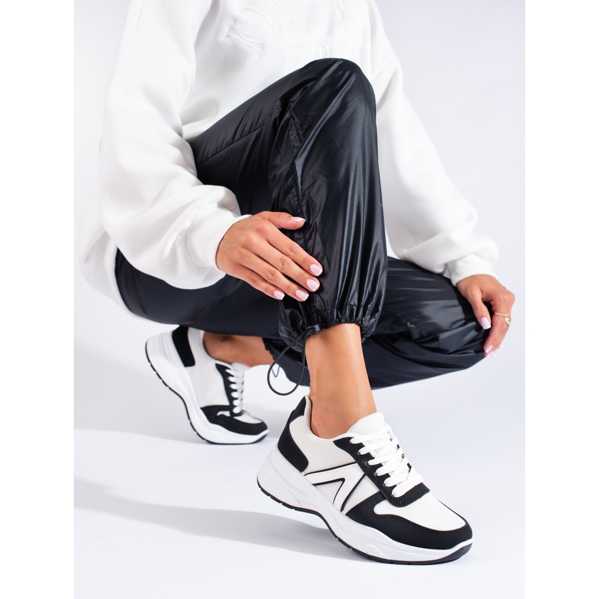 La fermeture à lacets permet un ajustement parfait au pied, ce qui augmente le confort d'utilisation. La doublure intérieure est en tissu, ce qui offre une douceur et un confort supplémentaires lors d'un port prolongé. Les chaussures Shelovet sont disponibles dans des couleurs à la mode - une combinaison de blanc et de noir, ce qui les rend parfaitement adaptées à de nombreux styles décontractés et sportifs.