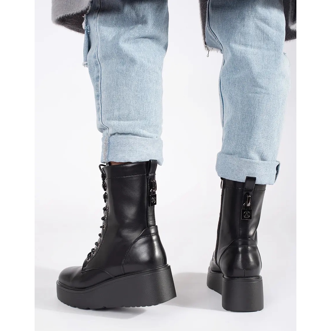 Une semelle noire épaisse avec une hauteur de 5,5 cm isole parfaitement du sol, et sa surface lisse facilite la marche dans différentes conditions. Les travailleurs ont un nez rond et un talon construit, ce qui leur donne un personnage classique. La fermeture à la fermeture à la fermeture à la fermeture et au laçage permet de mettre des chaussures et d'adapter les chaussures au pied, et la hauteur de la hauteur (19 cm) favorise la stabilité et le soutien de la cheville.