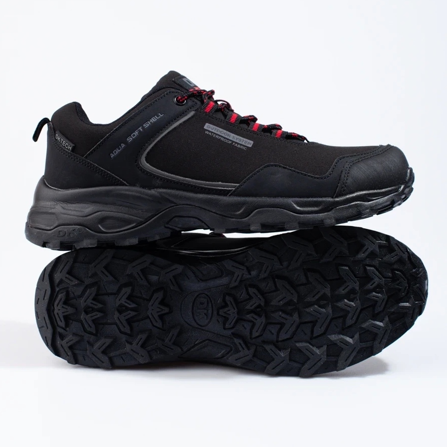 Des chaussures de trekking DK polyvalentes, légères et confortables dans une couleur noire classique - conçue pour les hommes actifs qui apprécient le confort lors de voies plus longues et d'utilisation quotidienne. La tige a été créée à partir de la combinaison du cuir écologique et des matériaux textiles (softshell), qui donne une bonne résistance au vent et assure une respirabilité élevée. Grâce aux matériaux utilisés, les chaussures montrent une résistance accrue à l'humidité, mais elles ne garantissent pas une imperméabilité à 100% - dans des conditions de pluie intense, ils peuvent être mouillés.