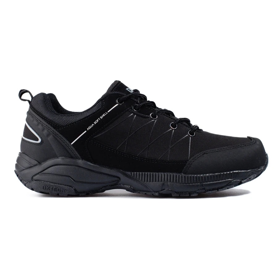 Chaussures de trekking masculin noir DK - durable, confortable et universel. Conçu pour les activités extérieures et sportives, utilisation quotidienne. La combinaison de cuir écologique et de matériaux textiles durables garantit la durabilité, et le design moderne rend les chaussures belles à la fois sur la piste et dans les conditions urbaines.