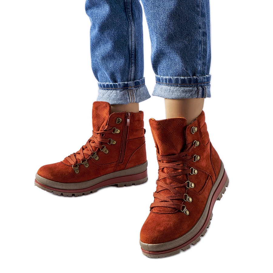 Ces bottes combinent le design moderne avec des solutions pratiques. Fabriqué en cuir écologique de haute qualité avec une texture en daim (rouge rouille / brun) ne sont pas seulement chauds grâce à l'isolation et à la fourrure à l'intérieur, mais également stables grâce à la semelle en caoutchouc plat et à la structure supérieure renforcée. La fermeture éclair et le laçage assurent un ajustement parfait et une mise en place confortable.