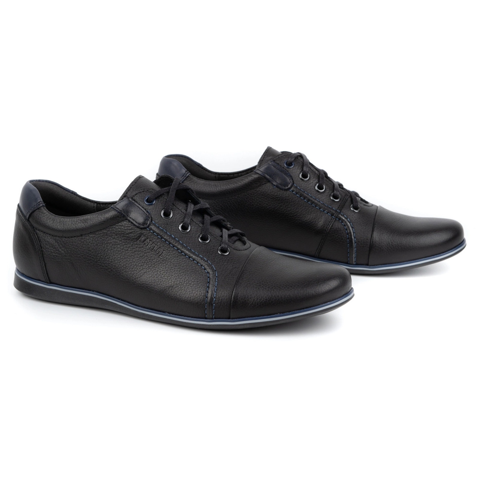 Chaussures masculines élégantes et universelles Kampol en cuir naturel - parfait tous les jours, pour le travail et pour les réunions décontractées intelligentes. La coupe classique et intemporelle en noir combine le confort et la durabilité.