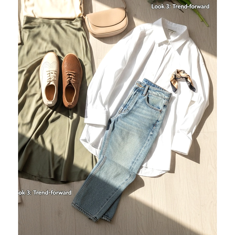 Look 3 - Tendance : Derby doux crème + jean vintage (légèrement délavé, autour de la taille) + chemise blanche oversize rentrée dans le pantalon. Effet parisien, sans prétention, élégant.