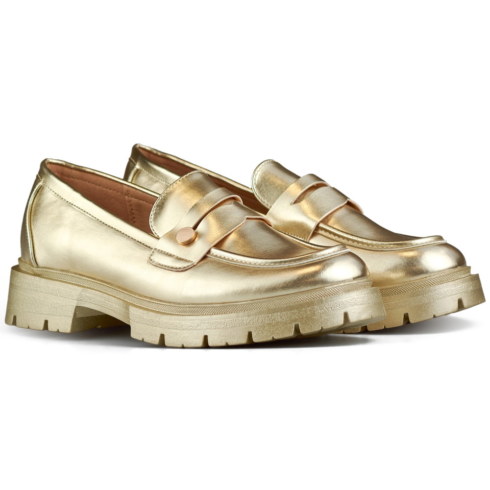 Ces chaussures uniques se distinguent par une couleur dorée métallique, qui attirera certainement l'attention et ajoutera la splendeur à chaque création. Le nez rond offre un confort de port, et le fermoir inséré le rend plus facile à mettre et à retirer. La plate-forme de 3,5 cm de haut donne un goût supplémentaire et offre un amorti adéquat des pieds.