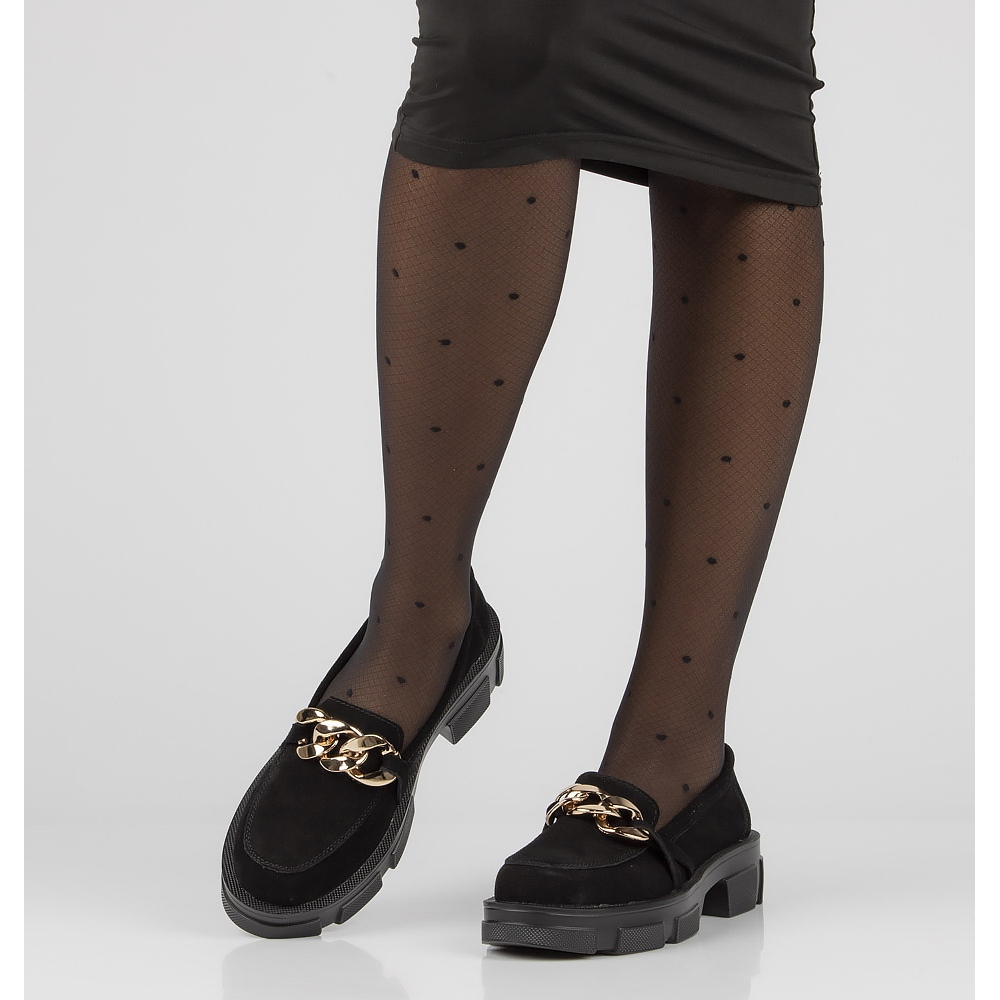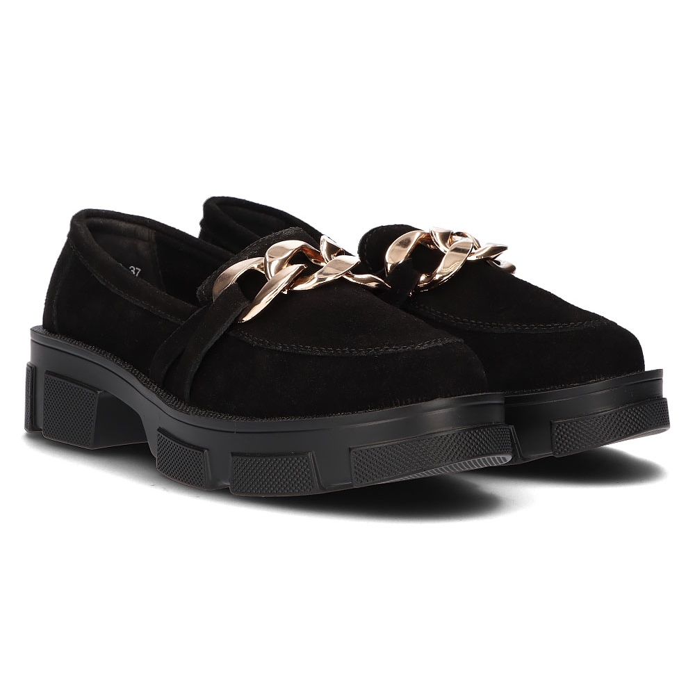 Le matériau extérieur est en cuir naturel de haute qualité, qui garantit durabilité et élégance, et l'insert intérieur en cuir naturel assure confort et respirabilité. La semelle en matière synthétique est légère et résistante à l'abrasion, ce qui affecte le confort d'utilisation au quotidien. Un avantage supplémentaire de ces chaussures est un détail subtil en forme de chaîne, qui leur confère un caractère moderne.