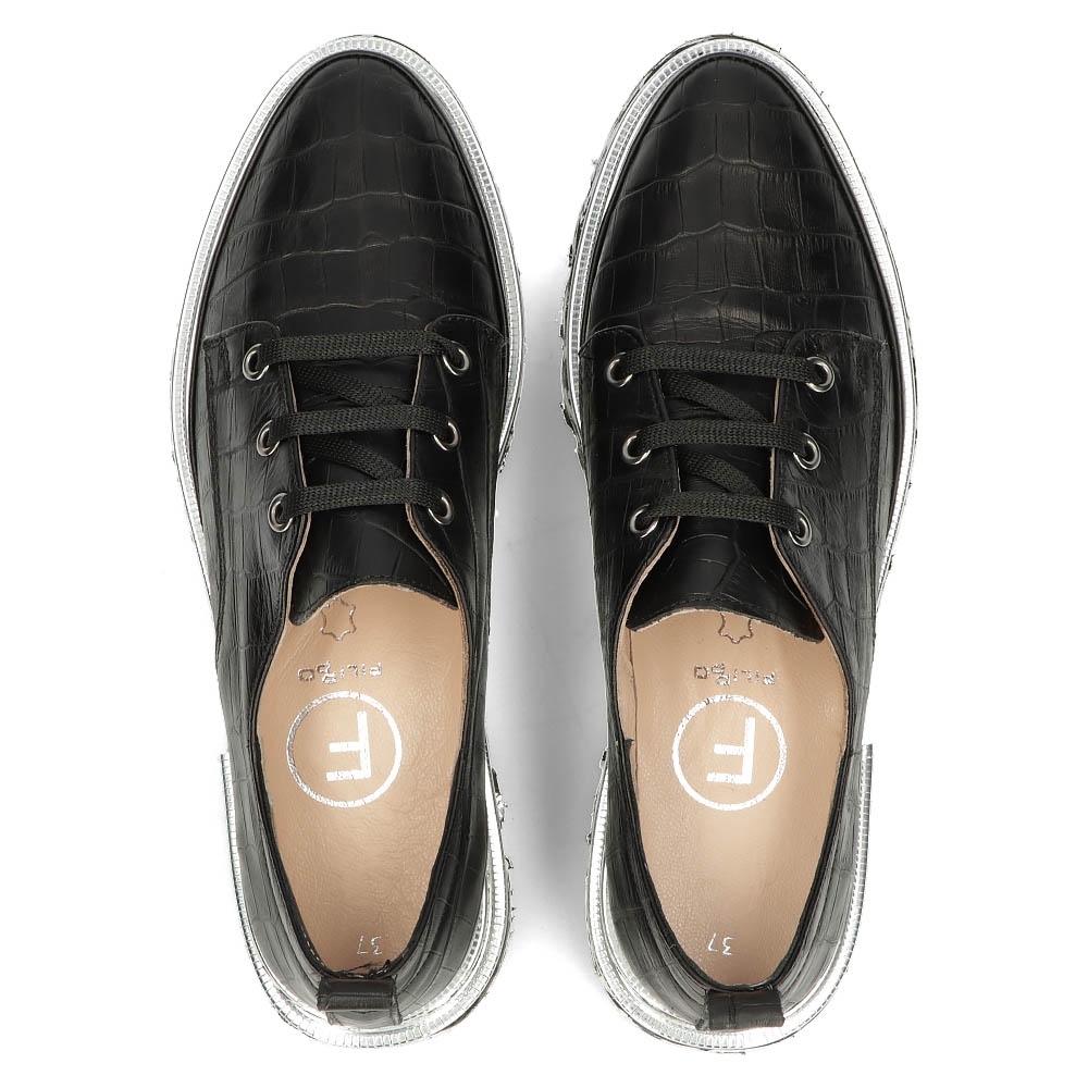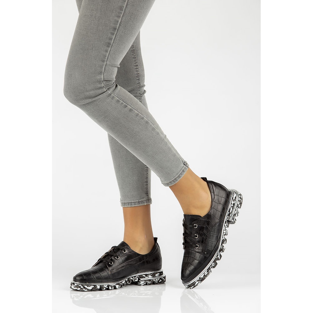 Les chaussures se caractérisent par un bout rond et une forme en amande, qui leur ajoutent une subtile élégance. La fermeture à lacets permet un ajustement parfait au pied et la hauteur supérieure de 7 cm les rend très universelles. La semelle est en plastique de haute qualité, avec une hauteur de plateforme de 4 cm, garantissant stabilité et confort au quotidien.