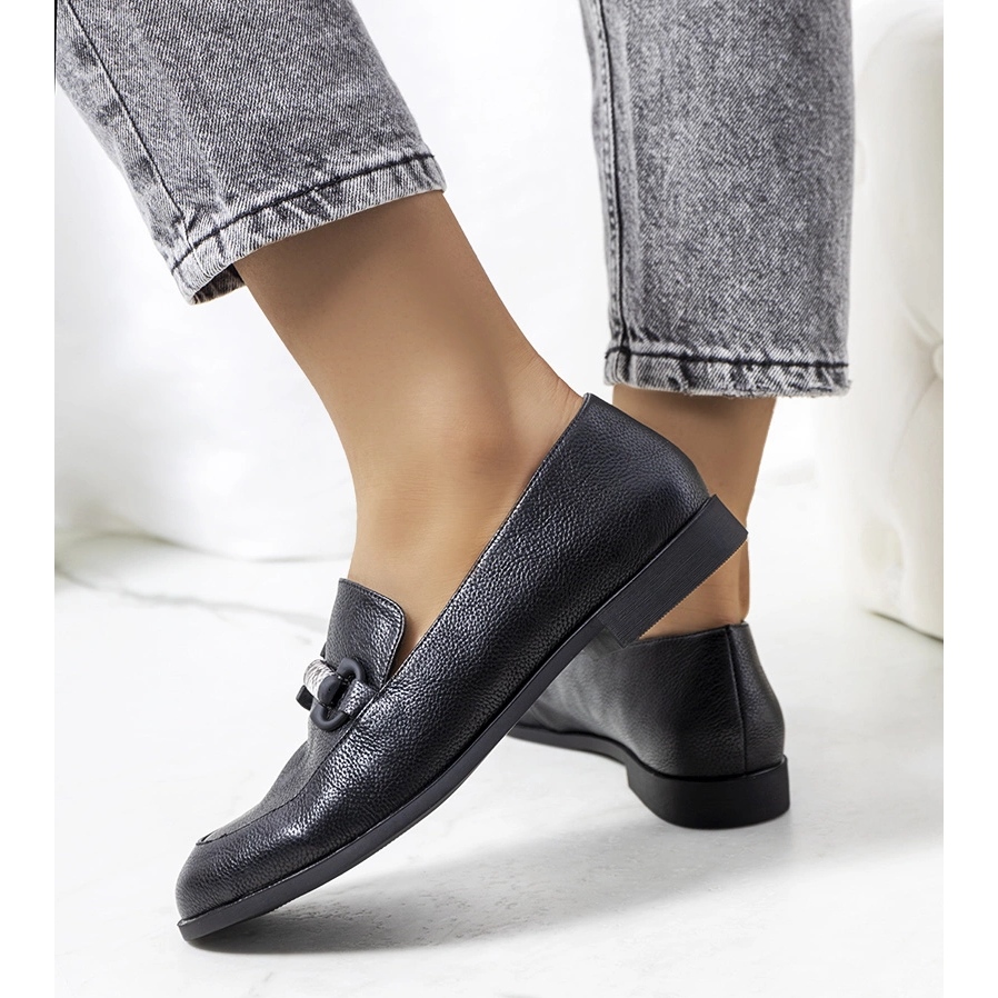 Nous vous présentons d'élégantes chaussures en cuir noir qui deviendront certainement un élément indispensable de votre garde-robe. Ce modèle élégant est parfait aussi bien pour un usage quotidien que pour des occasions plus formelles. La tige et la semelle intérieure en cuir naturel de haute qualité garantissent non seulement un confort de port exceptionnel, mais aussi une durabilité et une élégance.