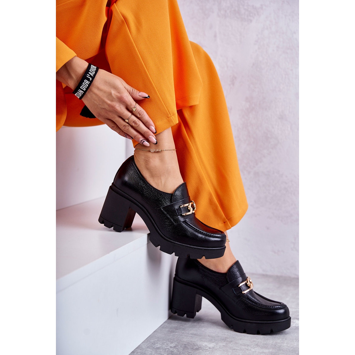 Les chaussures à talons hauts en cuir noir avec décoration dorée sont un choix idéal pour les femmes qui apprécient l'élégance combinée au confort. Ces chaussures à talons hauts uniques, d'une hauteur de 7,5 cm, se distinguent par un talon bloc solide et une plateforme délicate de 2,5 cm d'épaisseur, qui assure la stabilité au porté.