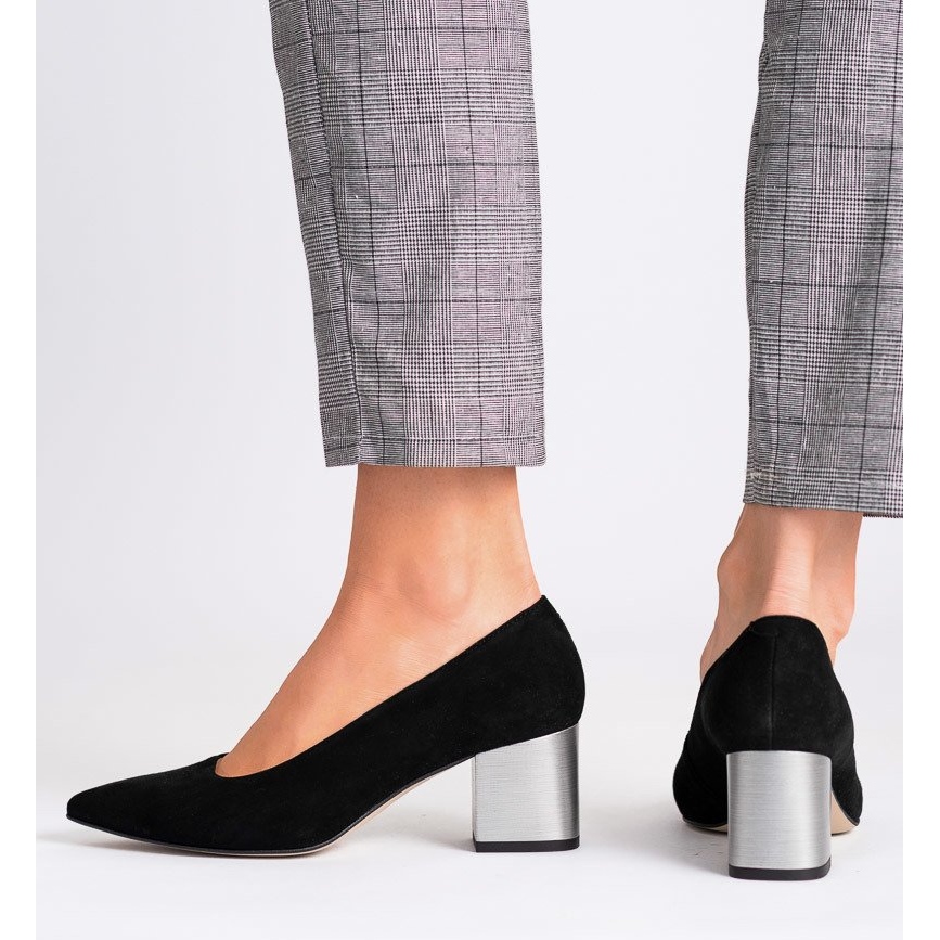 L'élément accrocheur de ces chaussures est un élégant talon haut de 6 cm qui imite l'apparence de l'acier brossé. Cela ajoute non seulement un caractère unique aux chaussures, mais assure également stabilité et confort de marche. Le devant pointu moderne de l'escarpin associé à une coupe minimaliste s'adapte parfaitement à la forme de la chaussure, créant un effet d'élégance avec une touche de chic urbain.