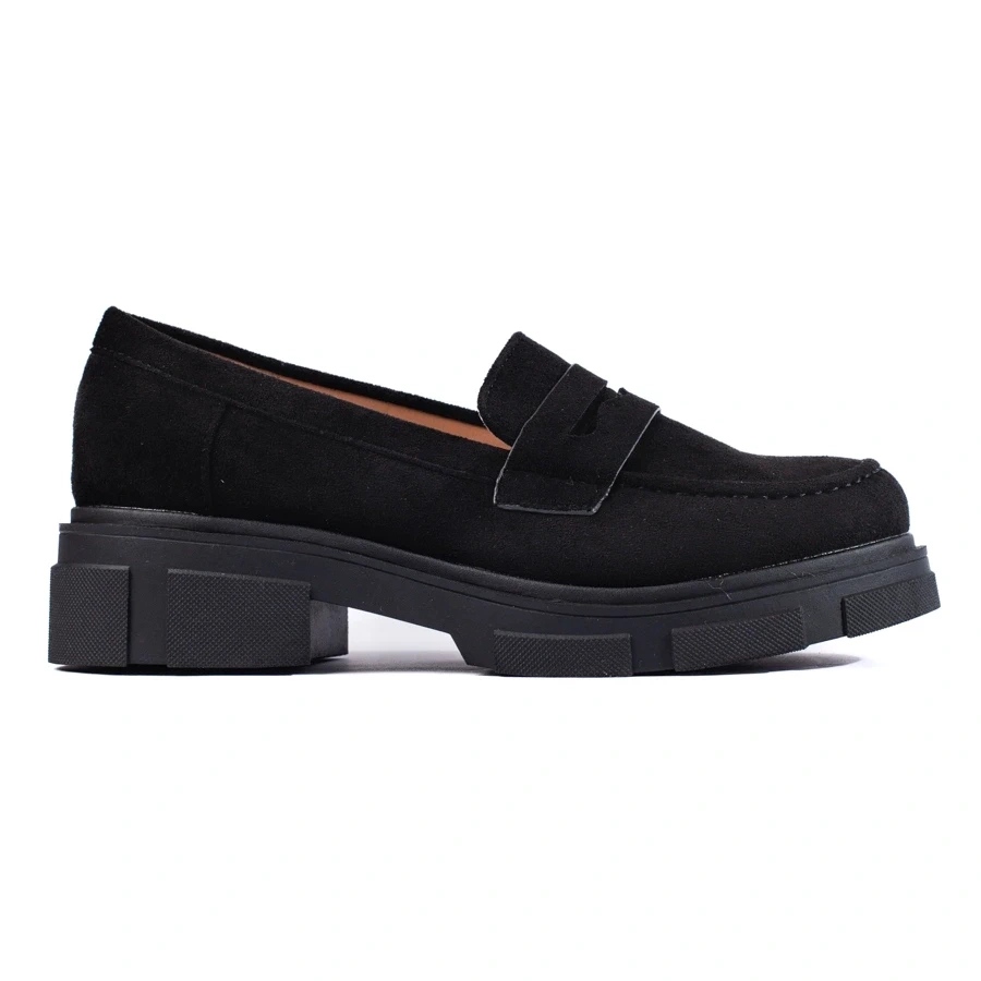 Chaussures noires élégantes et confortables en daim écologique. Une coupe classique et décontractée de mocassins avec un nez rond complet, construit-up et une fixation douce et un insert confortable de cuir écologique. Parfait pour une base quotidienne - pour le travail, pour une promenade et pour les stylifications urbaines.