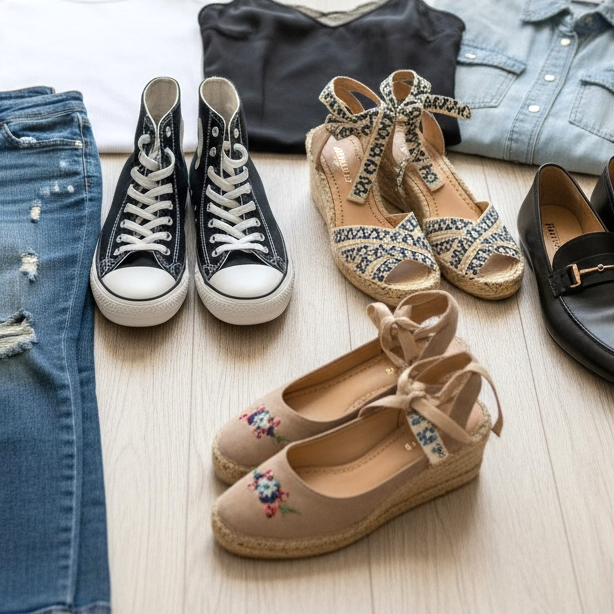 Au printemps et en été, vous pouvez également porter des sandales compensées ou des espadrilles avec votre haut et votre pantalon. Ces chaussures ajouteront un caractère estival à votre tenue, tout en étant à la mode et élégantes. Les modèles avec des cravates ou des décorations accrocheuses conviendront particulièrement bien.