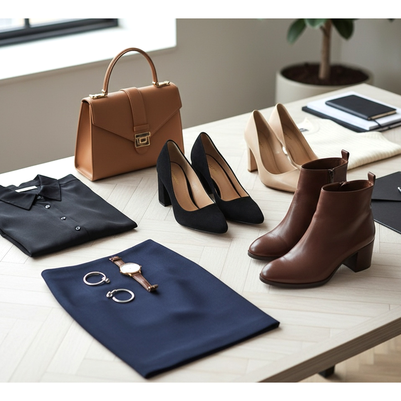 La solution parfaite sera des escarpins à talon bloc ou à talon aiguille. Choisissez des modèles aux couleurs sobres – noir, beige ou marron. N'oubliez pas qu'un haut et une jupe sont une combinaison classique, donc les talons hauts aideront à maintenir les bonnes proportions de la silhouette et à rendre l'ensemble du style harmonieux.