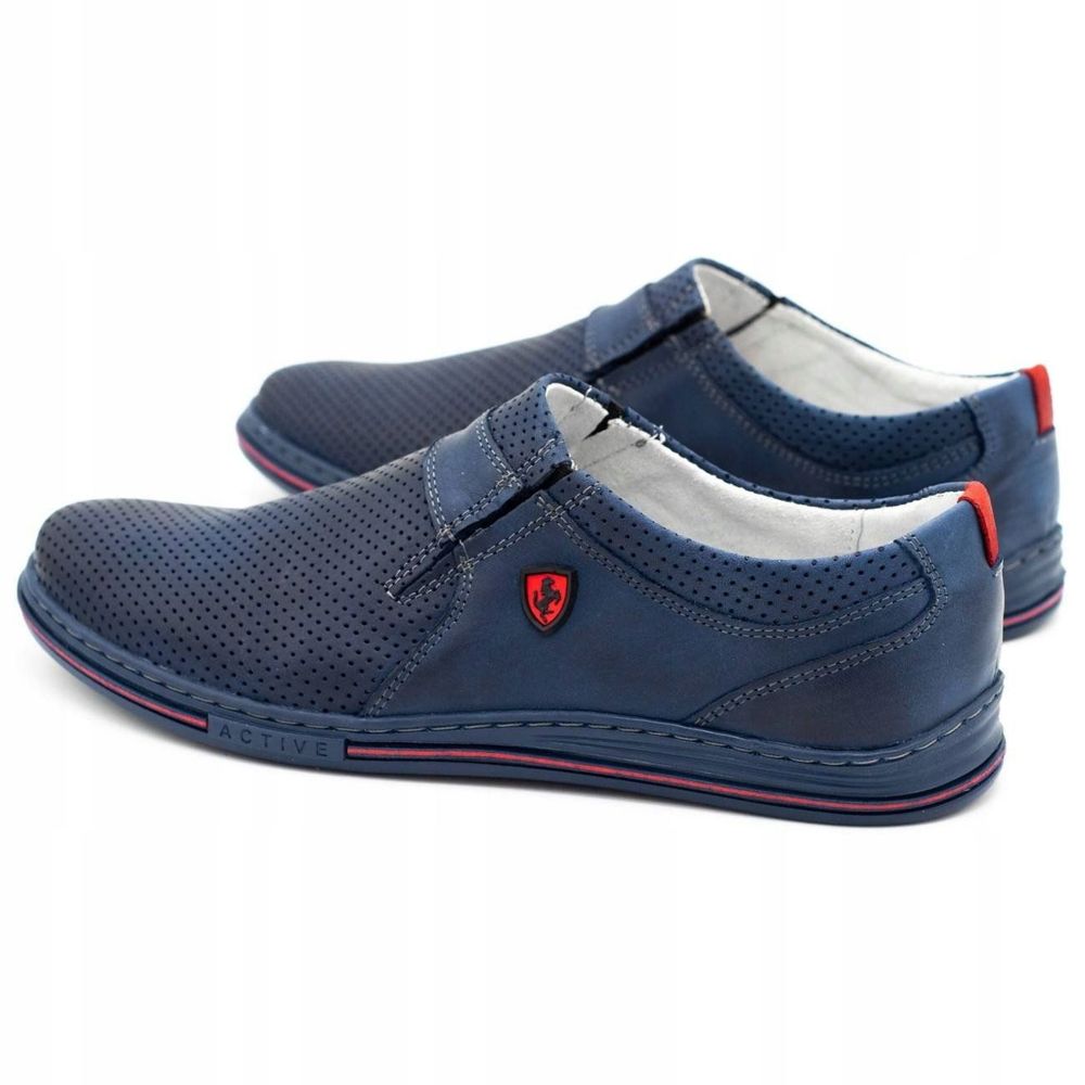 Polbut Men's Leather Shoes 362 - Elegance in the Daily Edition. Des chaussures glissées entièrement en cuir naturel dans une nuance universelle de marine (bleu marine / bleu). La tige perforée offre une meilleure ventilation, grâce à laquelle les chaussures sont respirantes et confortables toute la journée. Le cuir naturel avec une couleur intéressante et non uniforme gagne une apparence encore plus agréable au fil du temps et ne nécessite pas de soins spécialisés - il suffit de nettoyer régulièrement et de paniquer avec des chaussures étanches serrées.