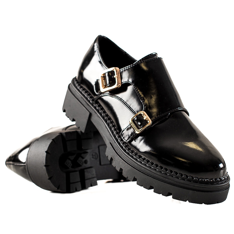 Les chaussures sont fabriquées avec des matériaux de haute qualité : la partie supérieure est en cuir verni écologique, ce qui leur confère un éclat unique, tandis que l'intérieur est composé d'une combinaison de simili cuir et de cuir naturel, ce qui assure un plaisir d'utilisation. Un nez rond et une fermeture à boucle ajoutent praticité et élégance.