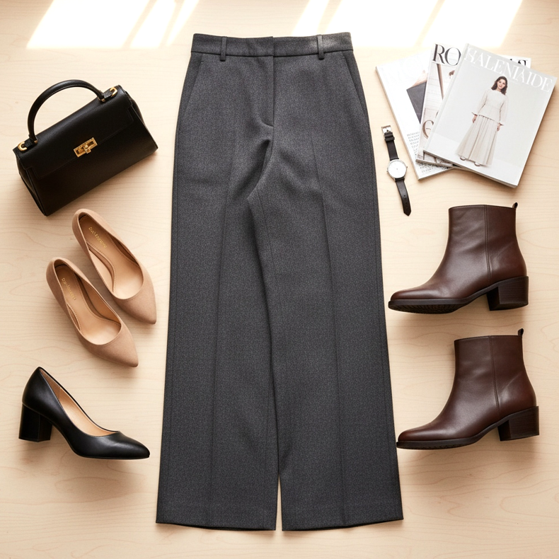La solution parfaite sera des escarpins à talon bloc ou à talon aiguille. Choisissez des modèles aux couleurs sobres – noir, beige ou marron. N'oubliez pas que les pantalons larges ont des jambes larges, donc les talons hauts aideront à maintenir les bonnes proportions de votre silhouette.