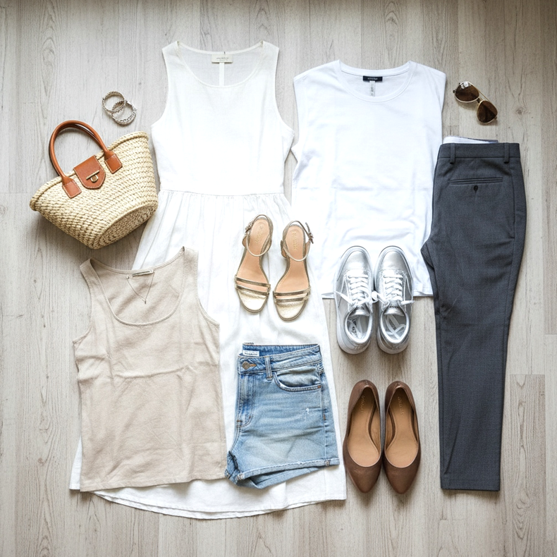 Des sandales métalliques dorées avec une robe en lin blanc sont un classique de l'été. De simples chaussures noires élèvent l’ensemble de la tenue à un niveau d’élégance, tout en ayant un aspect naturel et informel.