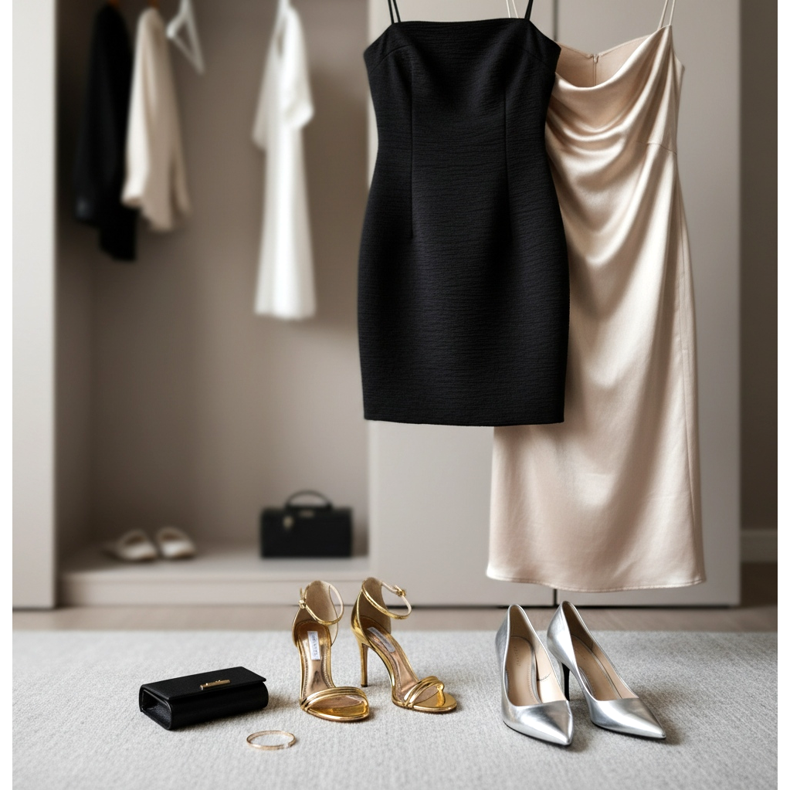 Des sandales à talons hauts dorées avec une mini-robe noire sont un choix classique pour une soirée. Ce tandem ne vieillit jamais et impressionne toujours. Des escarpins argentés avec une robe midi en satin sont une excellente idée pour un grand événement - un mariage, une communion ou un bal élégant.