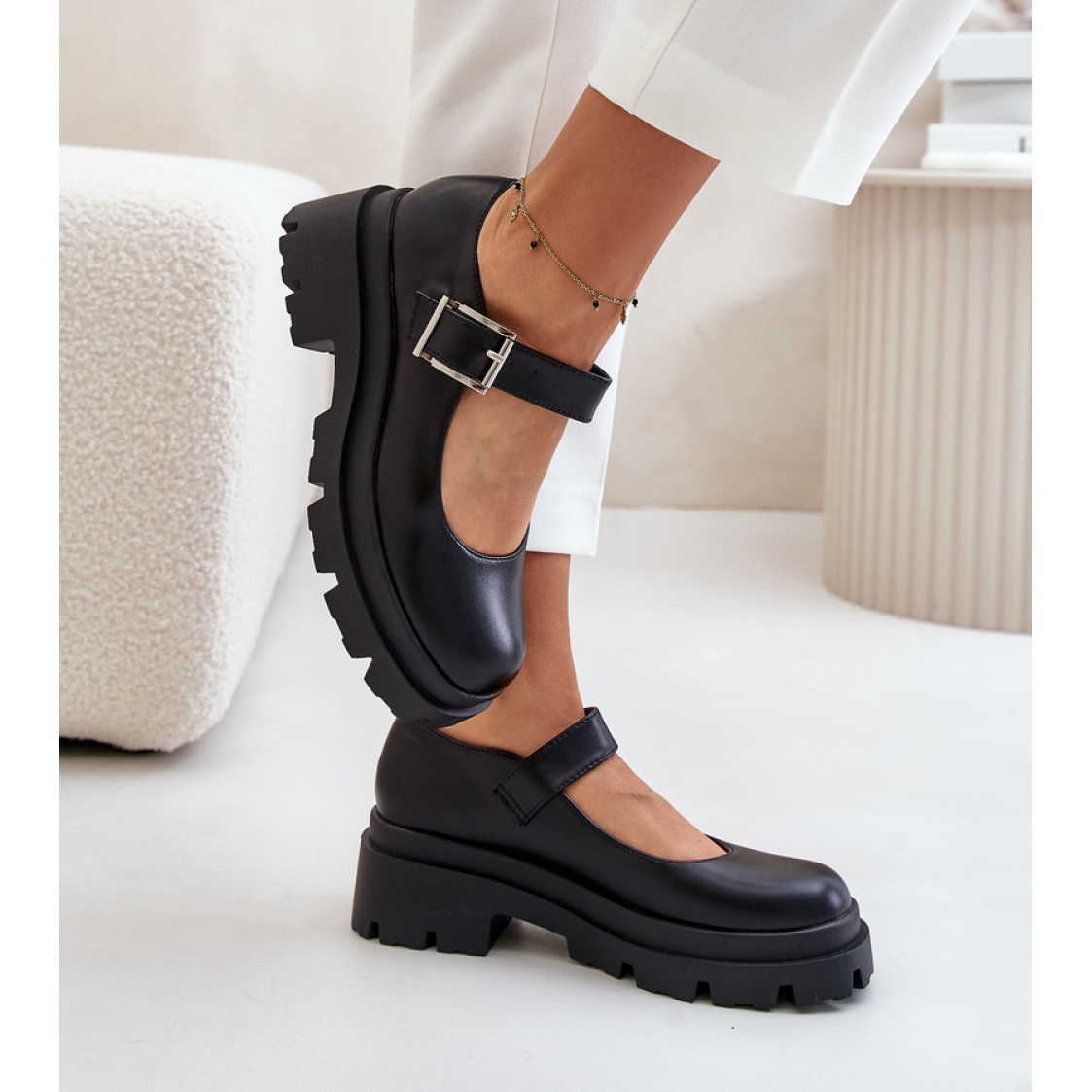 Chaussures élégantes pour femmes en cuir écologique. Ce modèle possède une bride réglable avec une boucle, qui permet un ajustement parfait au pied. Bouts arrondis. Montés sur une plateforme et un talon plat, ils assurent un confort de port tout au long de la journée, tout en soulignant un look mode.